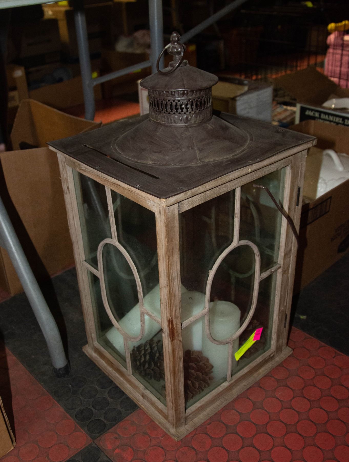 LANTERN APPROX 2 FT TALL WOOD/GLASS WITH CANDLES IN IT-ESTATE **ALL ITEMS MUST BE REMOVED BY 5PM SATURDAY, MAY 20TH 2023. ALL REMAINING ITEMS WILL BE SUBJECT TO A $6.00 PER DAY STORAGE CHARGE. ANY ITEMS REMAINING AFTER MONDAY, JUNE 5TH, 2023 WILL BE CONSIDERED FORFEITED. NO REFUNDS WILL BE ISSUED FOR FORFEITED ITEMS. TO SCHEDULE A PICK UP APPOINTMENT CLICK HERE