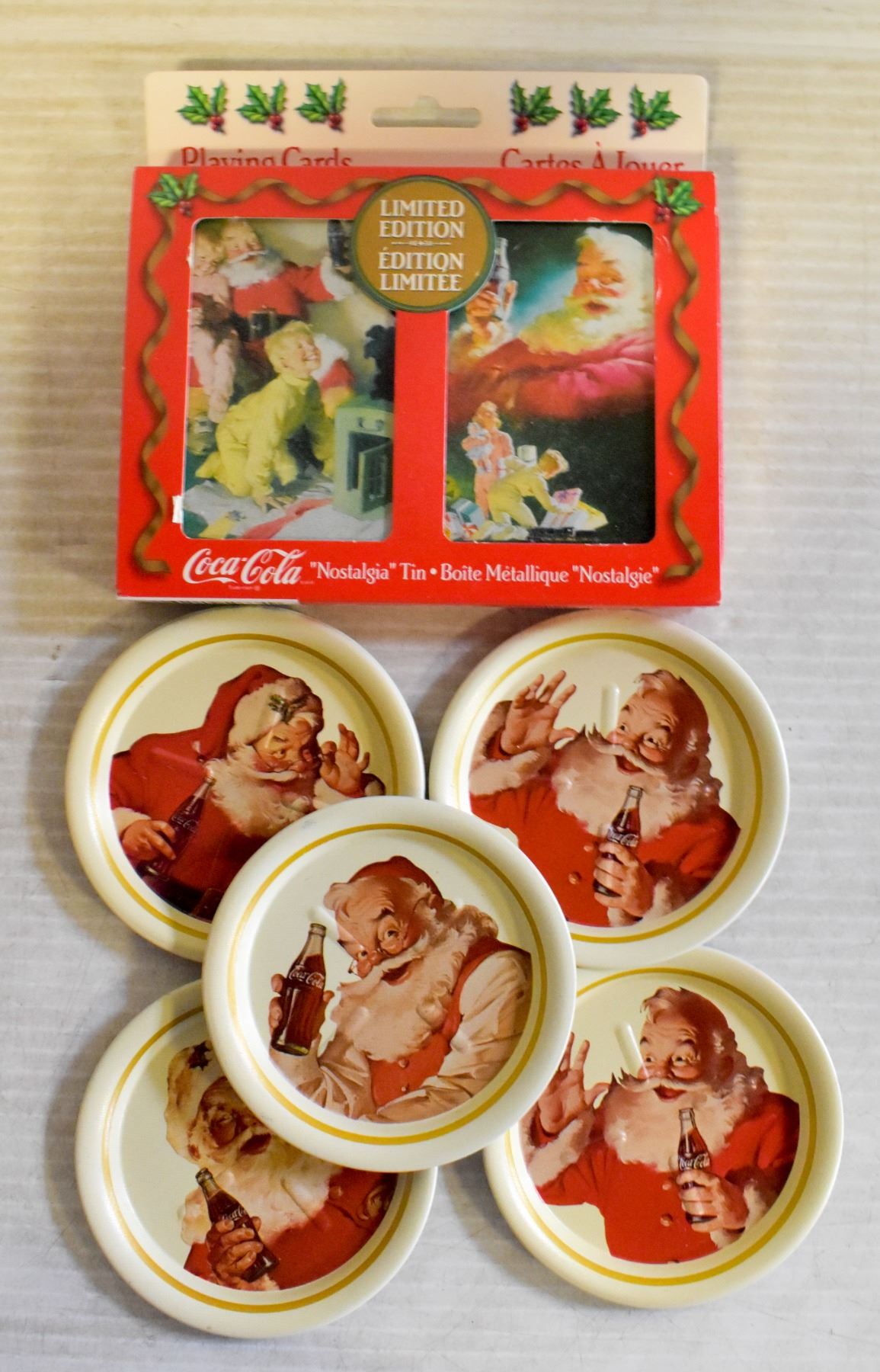 6 XMAS COASTERS AND 2 DECKS OF COKE XMAS THEMED PLAYING CARDS IN DECRATIVE TIN