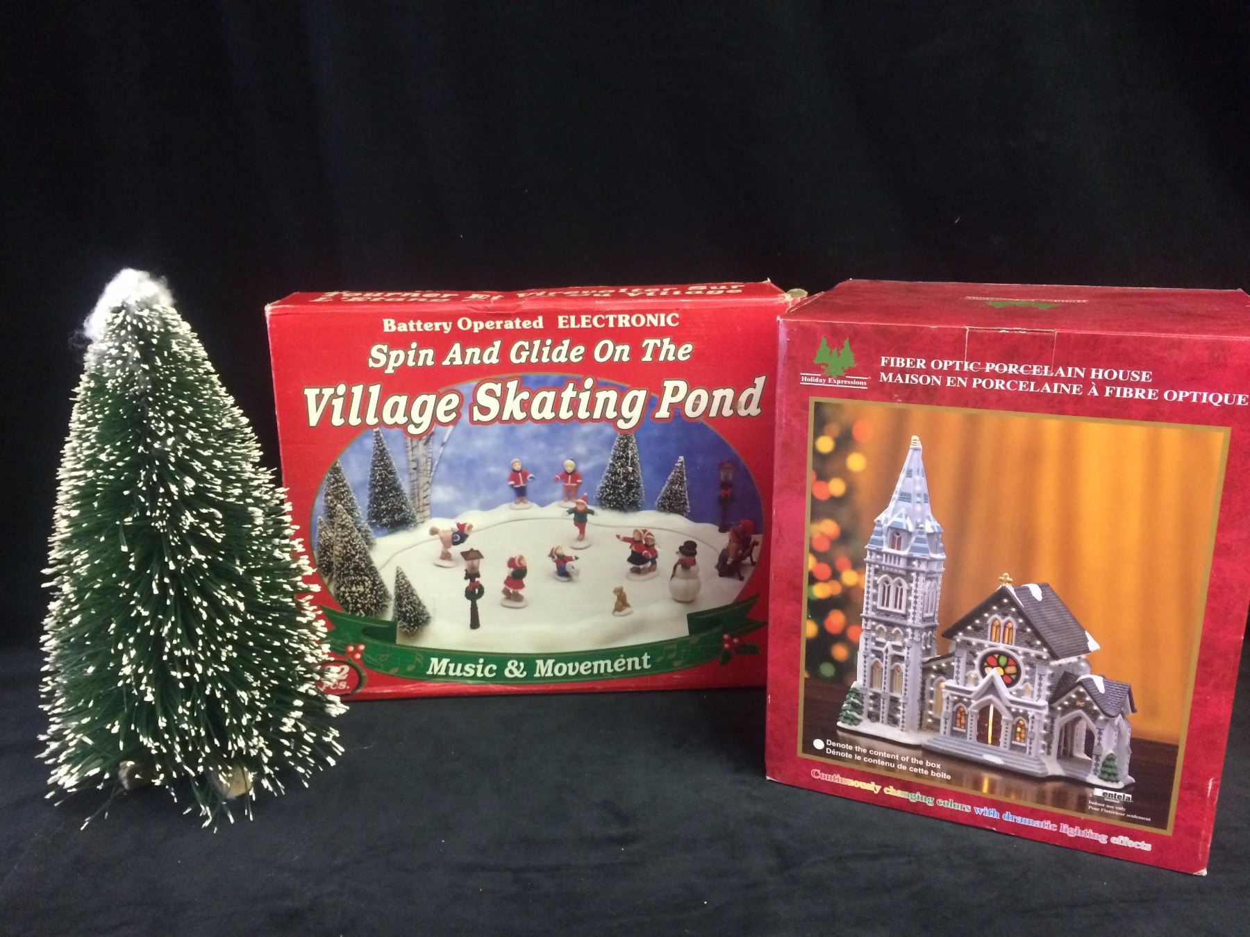 FIBER OPTIC PORCELAIN HOUSE, BATTERY OPERATED ELECTRIC SKATING POND