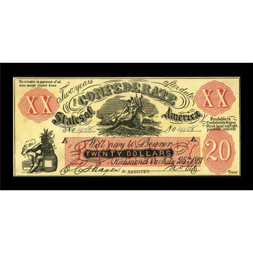 <B>XX-1 $20 Female Riding Deer Bogus Note.</B></I><BR> The Female Riding Deer (FRD) fantasy or bogus note was thought for years to be an official Confederate issue and in fact saw widespread circulation. No Confederate collection is complete without an example. The central vignette is actually of the Roman goddess <I>Diana</B></I>. Recently discovered evidence about this issue is discussed in detail in <I>Counterfeit Confederate Currency </B></I> by George R. Tremmel. This red overprint example has printed signatures and a hand-written serial number of "4158." This example has a green ornate back and the grade is extraordinary for a FRD. This is now generally believed to be a post-Civil War woodcut rendering of a Samuel Upham note. <B>Choice Crisp Uncirculated.</B></I><BR><BR><b>Shipping:</b> Coins & Currency (<a target="_blank" href="http://www.heritageauctions.com/common/shipping.php">view shipping information</a>)
