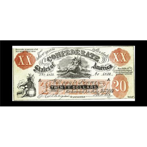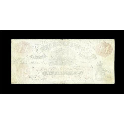 <B>XX-1/A1 $20 Female Riding Deer Bogus Note.</B></I> Recent evidence of this bogus note is discussed in detail in <I>Counterfeit Currency of the Confederate States of America</B></I> by George R. Tremmel. This orange overprint example has printed signatures and serial number 6430. This FRD note with the blank back is probably a war time Samuel Upham note or a note done by one of his competitiors. The top edge has a few small tears. Bright <B>Extremely Fine-About Uncirculated.</B></I>