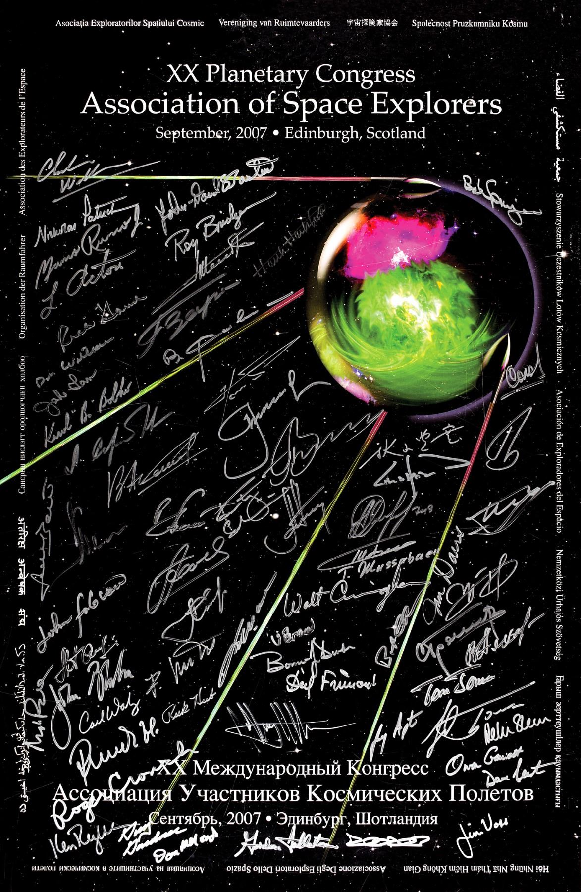 Appealing color 22 x 33.5 poster for the XX Planetary Congress of the Association of Space Explorers (ASE), which took place in Edinburgh, Scotland between September 17-21, 2007, signed in silver ink by over 60 participating astronauts from 15 nations, including: Rusty Schweickart, Alexei Leonov, Walt Cunningham, Vance Brand, Gordon Fullerton, Owen Garriott, Karol J. Bobko, John Blaha, Hank Hartsfield, Roy Bridges, Jr., Rick Hieb, Jeffrey Hoffman, Toyohiro Akiyama, Charles Walker, Jan Davis, Nicholas Patrick, Jim Voss, Miroslaw Hermaszewski, and many more. Rolled and in fine condition. Accompanied by 'signature key' packet for the poster.