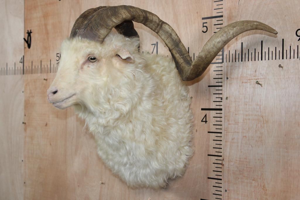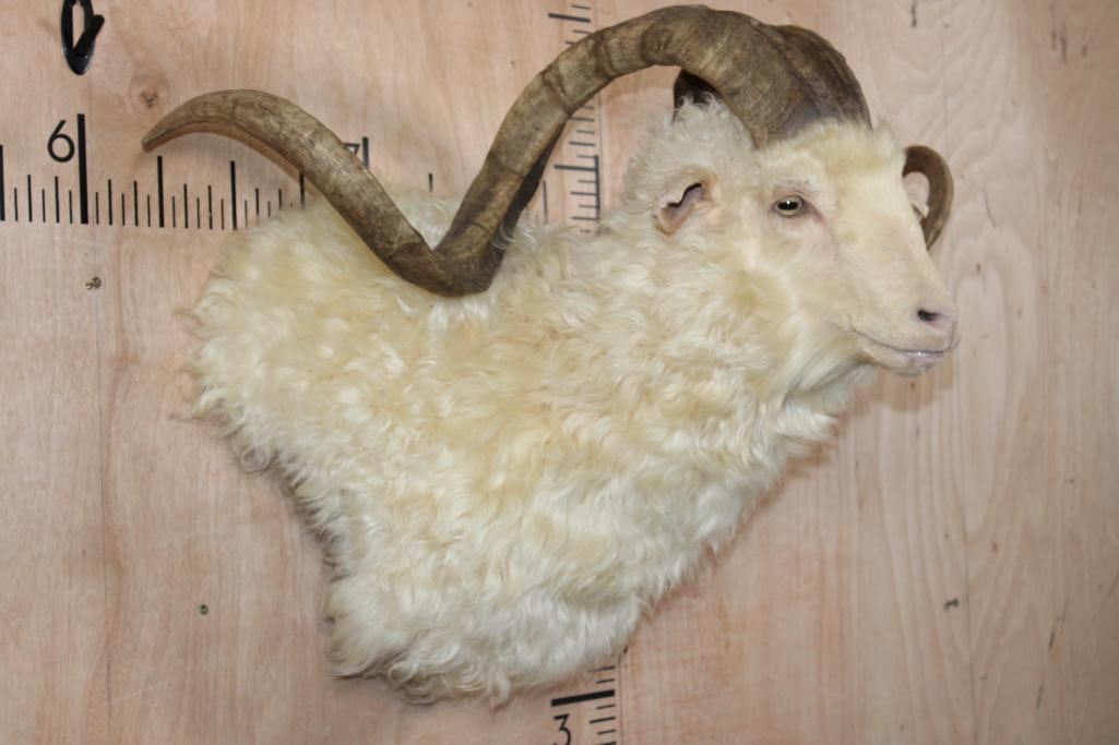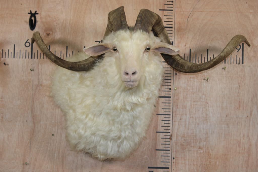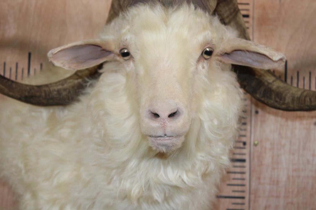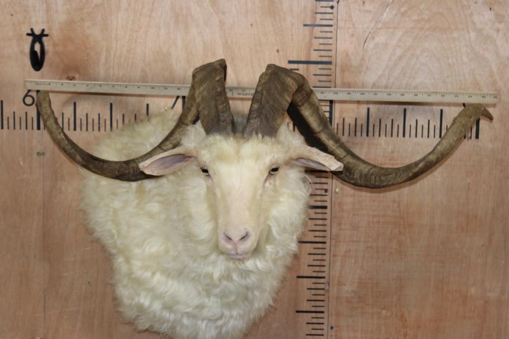 Very Nice, Newer, and Clean XXL ANGORA GOAT Wall Pedestal. It has a 36 1/8" Horn Spread and is in Very Good Condition. TAXIDERMY