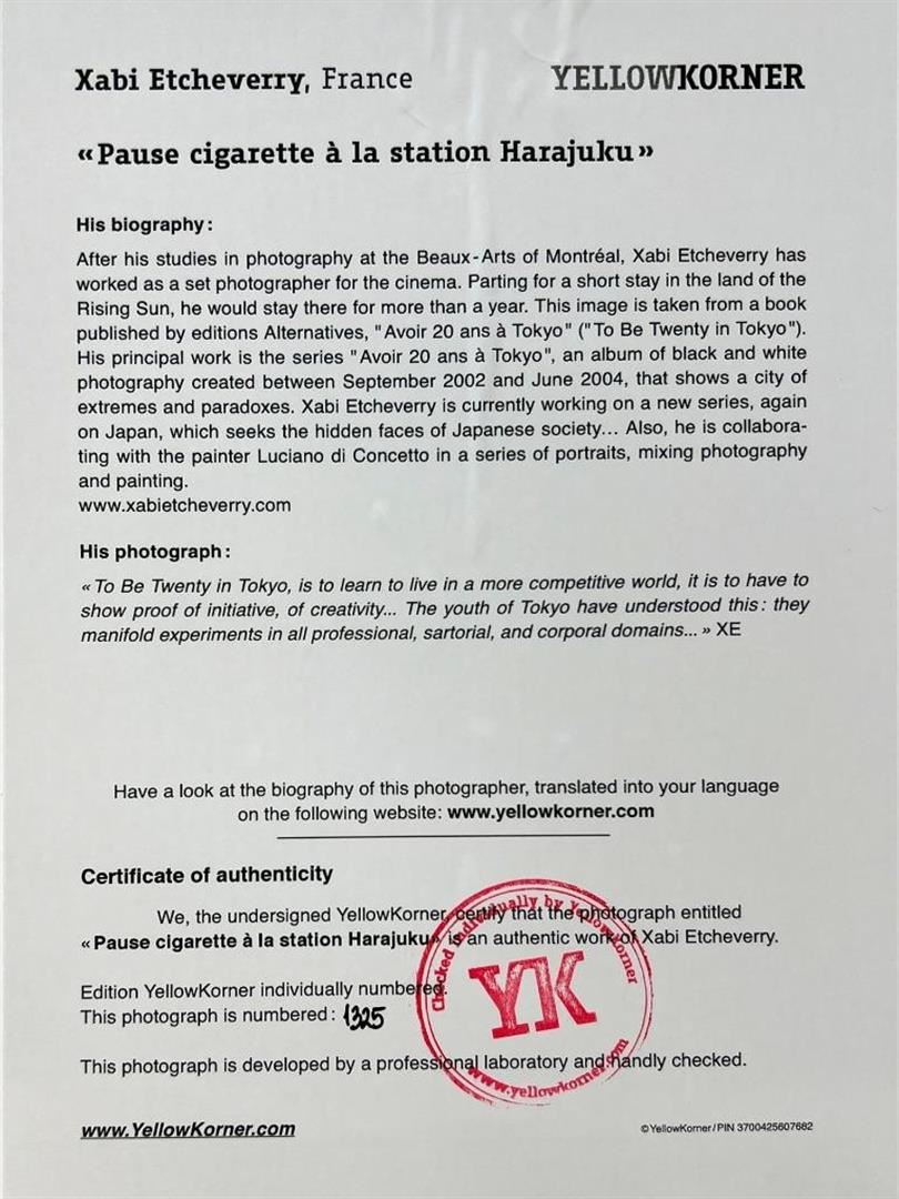 Xabi Etcheverry Pause Cigarrete To Be Twenty in Tokyo Harajuku YellowKorner Certified Photograph. Certificate of Authenticity from YellowKorner affixed to the back. Matted Dimensions 16"x20". Protected with Clear Mylar Sleeve.