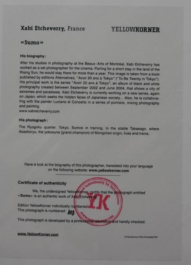 Sumo Certified Photograph, Xabi Etchverry YellowKorner Certified Photograph. Certificate of Authenticity from YellowKorner affixed to the back. Matted Dimensions 16"x20". Protected with Clear Mylar Sleeve.