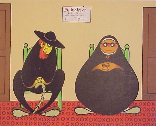 Xavier Cugat (1898-1990) Cuban, THE RABBI & THE NUN AT THE PSYCHIATRIST’S OFFICE, color screenp...