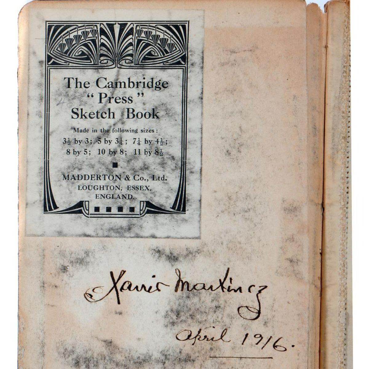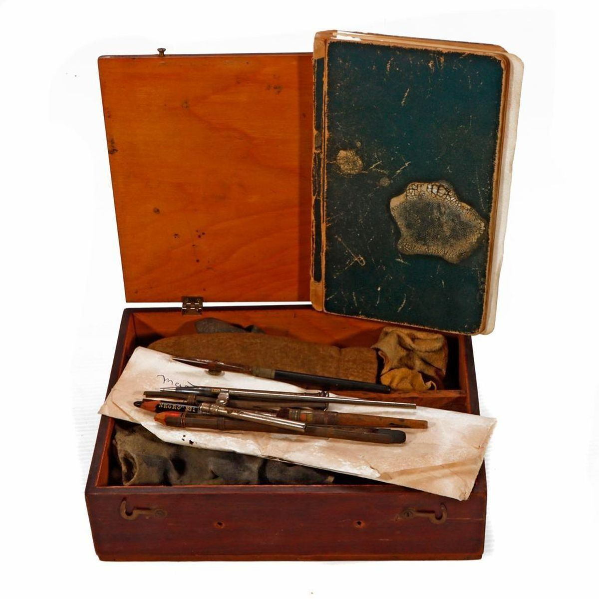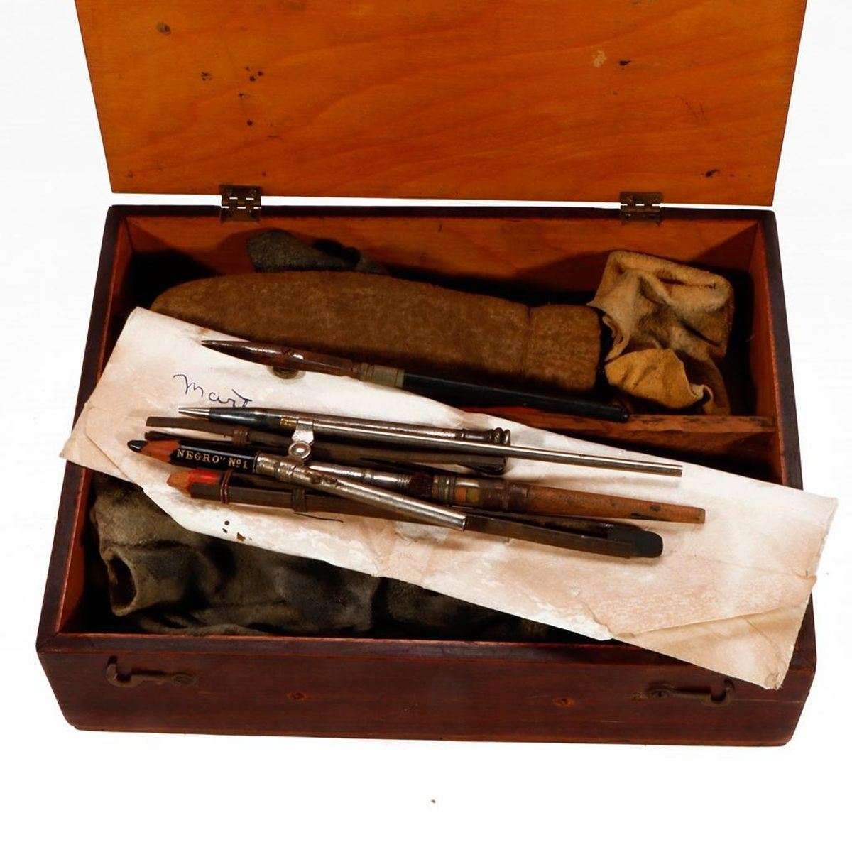 A grouping consisting of Xavier Martinez's charcoal box, drawing instruments, and a small sketchbook. MARTINEZ, XAVIER. 1869-1943. 1.) Leather sketchbook with Martinez's signature on paste-down, dated April 1916. 7 1/4in x 4 7/16in. There are at least 40+ sketches, including charcoal, pencil, pastels/chalks; some appear to be plans/layout sketches for paintings or other works, and several showing figures and landscapes that look to be based on his Arizona trip (1913 or a later visit). There are also doodles of his monogram designs, and sketches dated 1917 and 1920. Condition: The book is in fair condition, with scratches/losses, spine loose; there is some toning, but overall the individual sketches are in good condition. 2.) Drawing tools, identified on an envelope in Elsie Whitaker Martinez's hand: "Marty drawing Instruments". Consists of two reed pencil/charcoal holders, one with stubs of each; two metal drawing tools, once marked Made in Germany; a Farber metal pencil holder with pencil stub; a Wahl Eversharp silver-plated mechanical pencil; and a charcoal brush. 3.) A hinged lid wood drawing box, with Xavier Martinez's "X" monogram painted on the lid; 6 5/8in x 8 3/4in x 2 1/4in. The box contains numerous pencil, charcoal, and chalk stubs, several smudging tools, a brush, and chamois cloths. Condition: The box with use wear/scratches, one hinge is detached. From the Family of Xavier Martinez (1869-1943), Elsie Whitaker Martinez (1890-1984), and Micaela Martinez DuCasse (1913-1989).