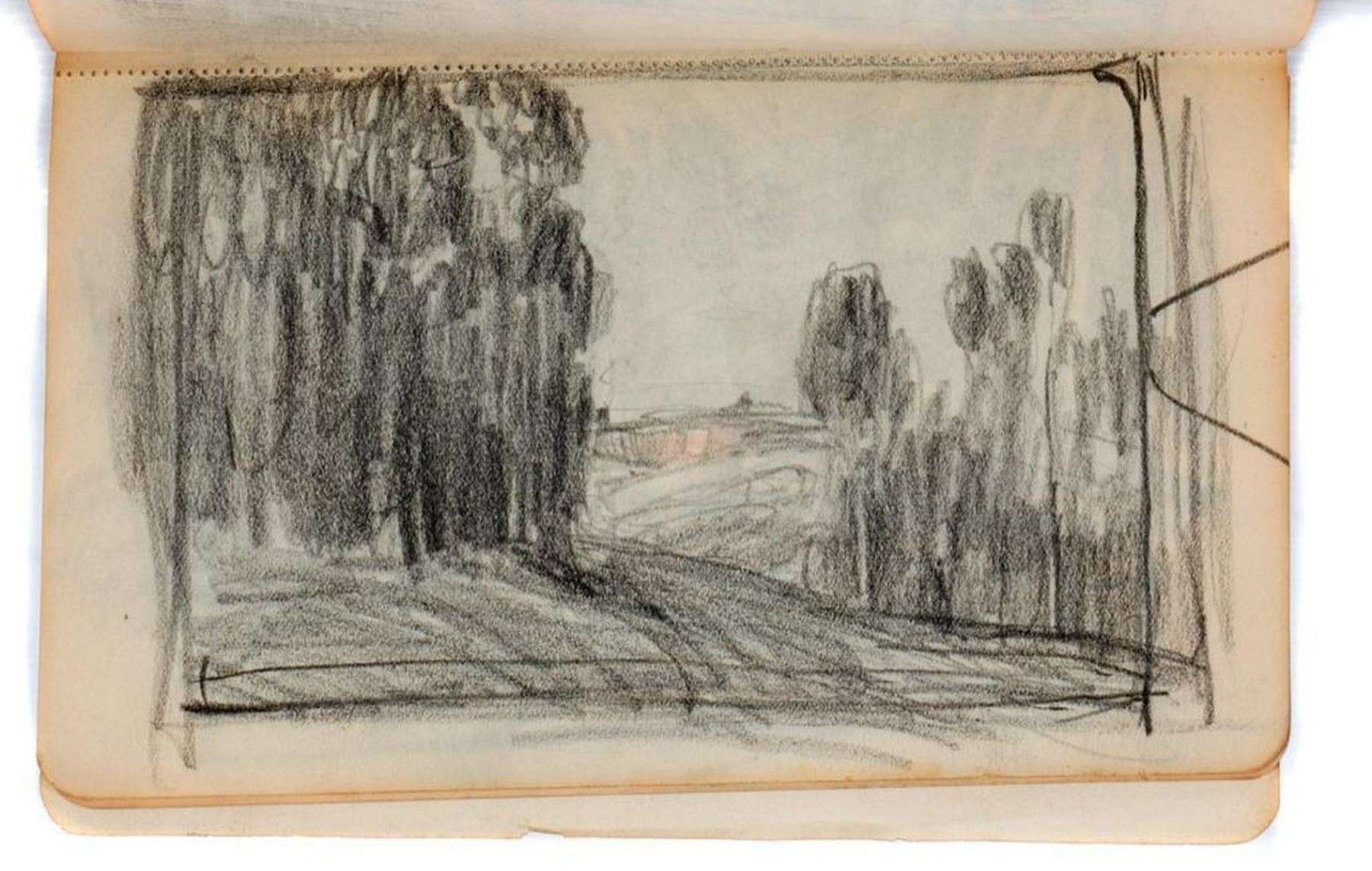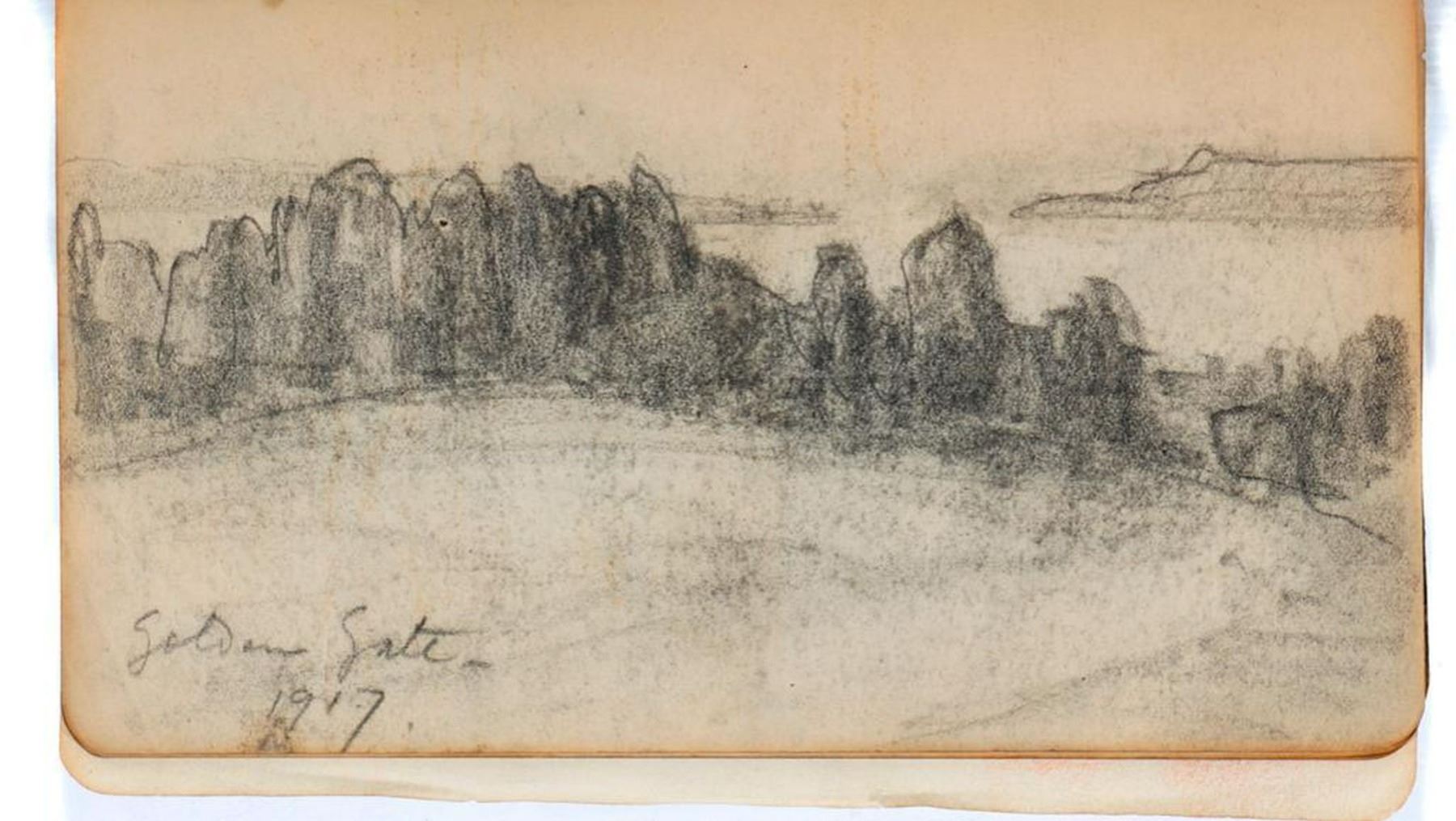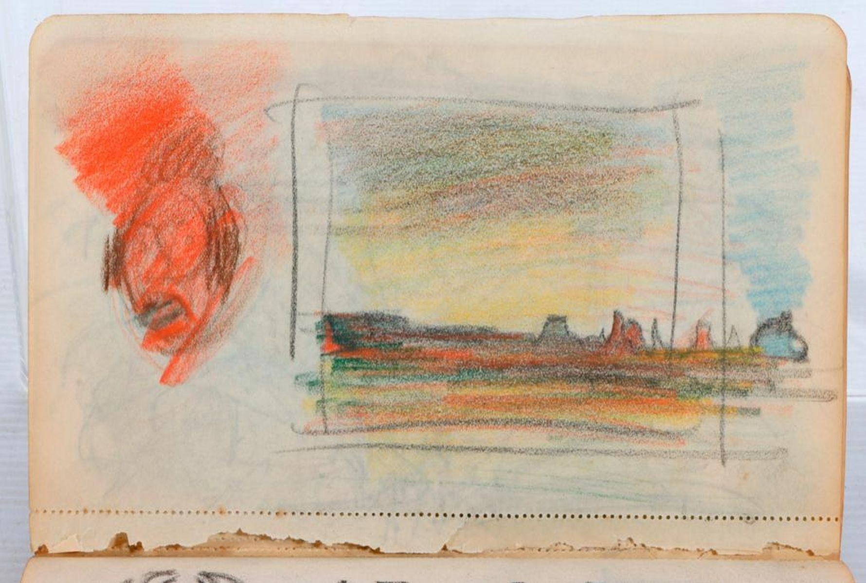 A grouping consisting of Xavier Martinez's charcoal box, drawing instruments, and a small sketchbook. MARTINEZ, XAVIER. 1869-1943. 1.) Leather sketchbook with Martinez's signature on paste-down, dated April 1916. 7 1/4in x 4 7/16in. There are at least 40+ sketches, including charcoal, pencil, pastels/chalks; some appear to be plans/layout sketches for paintings or other works, and several showing figures and landscapes that look to be based on his Arizona trip (1913 or a later visit). There are also doodles of his monogram designs, and sketches dated 1917 and 1920. Condition: The book is in fair condition, with scratches/losses, spine loose; there is some toning, but overall the individual sketches are in good condition. 2.) Drawing tools, identified on an envelope in Elsie Whitaker Martinez's hand: "Marty drawing Instruments". Consists of two reed pencil/charcoal holders, one with stubs of each; two metal drawing tools, once marked Made in Germany; a Farber metal pencil holder with pencil stub; a Wahl Eversharp silver-plated mechanical pencil; and a charcoal brush. 3.) A hinged lid wood drawing box, with Xavier Martinez's "X" monogram painted on the lid; 6 5/8in x 8 3/4in x 2 1/4in. The box contains numerous pencil, charcoal, and chalk stubs, several smudging tools, a brush, and chamois cloths. Condition: The box with use wear/scratches, one hinge is detached. From the Family of Xavier Martinez (1869-1943), Elsie Whitaker Martinez (1890-1984), and Micaela Martinez DuCasse (1913-1989).