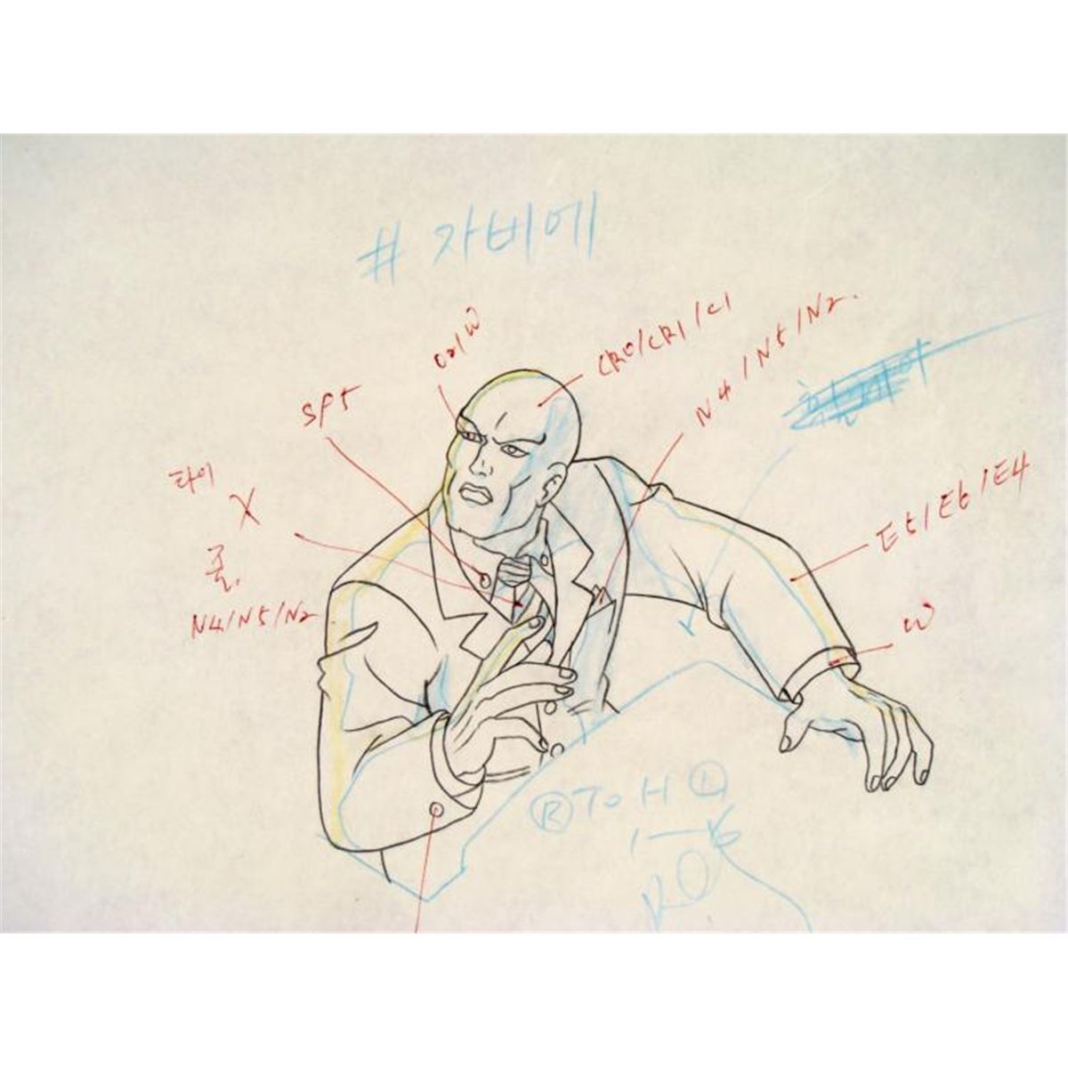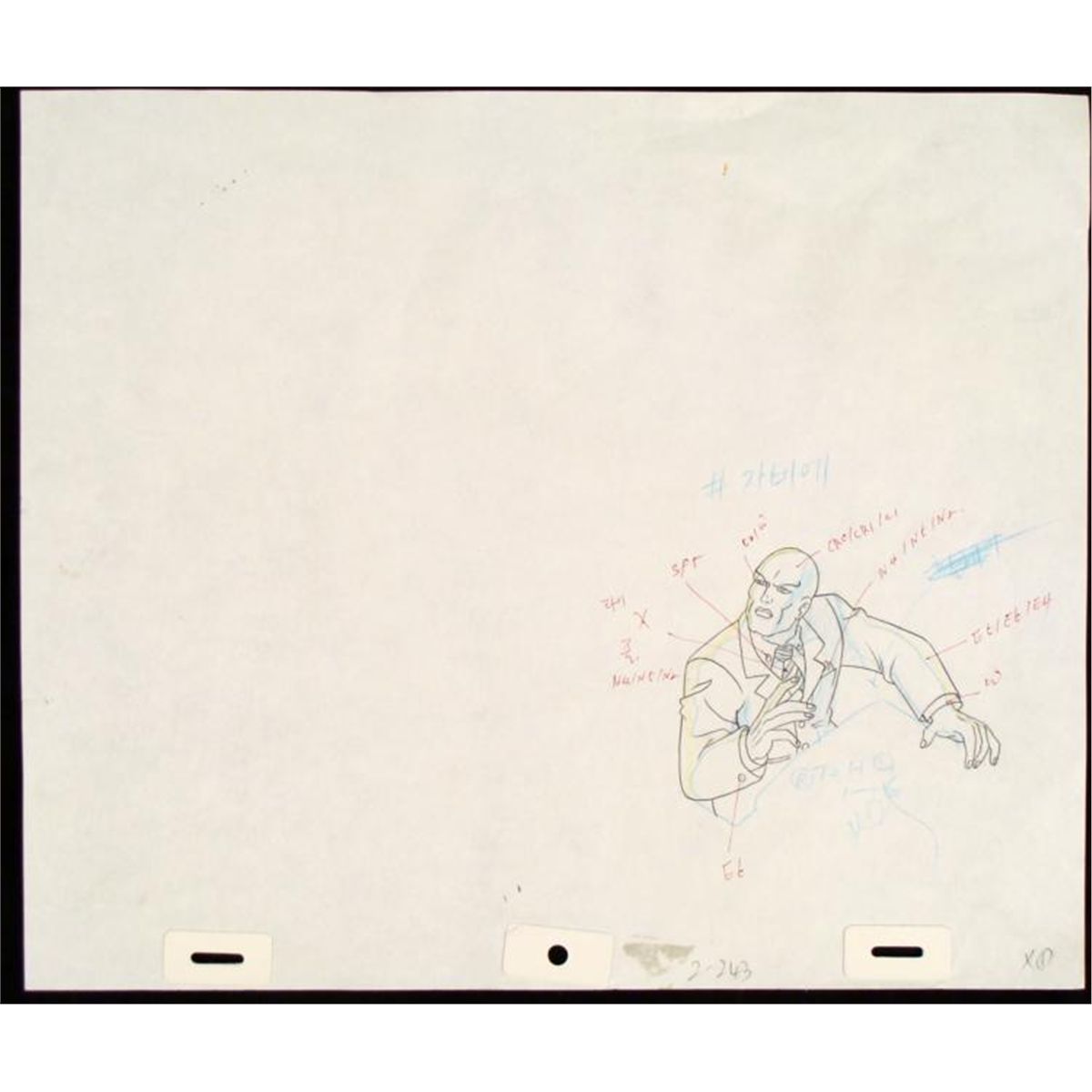 Under a cloud of increasing anti-mutant sentiment, Professor Xavier creates a haven at his Westchester mansion to train young mutants to use their powers for the benefit of humanity, and to prove mutants can be heroes. Xavier recruited Cyclops, Iceman, Angel, Beast and Jean Grey calling them "X-Men" because they possessed the "x-gene", an ability normal humans lacked. Early issues introduced the team's arch enemy, Magneto and his Brotherhood of Evil Mutants, who would later battle the X-Men for years. * * It appears that something has caught Professor X's attention. * Original "rough" animation drawing, in non-photo blue, black, and yellow with the notations in black, red, and non-photo blue.Overall size is a 12-field drawing that is 10 1/2" × 12 1/2" Excellent condition Traditional animation is a multi-step process which includes various types of art techniques. Drawings are a key part of the process, in which the animator creates the design and movement of the characters. Drawings are then transferred onto acetate cels (by hand-inking and/or photo copying) to create a production cel, which is then hand painted on the back side, using paint colors chosen and approved by the creator of the series. * * The drawing is ready to be matted and framed. The animators notations are located at the top and bottom of the drawing. *