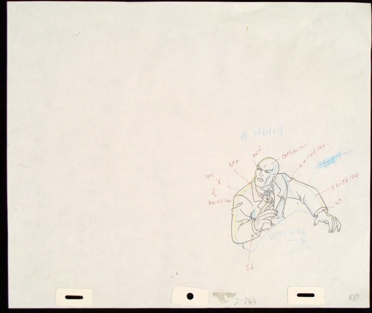 Under a cloud of increasing anti-mutant sentiment, Professor Xavier creates a haven at his Westchester mansion to train young mutants to use their powers for the benefit of humanity, and to prove mutants can be heroes. Xavier recruited Cyclops, Iceman, Angel, Beast and Jean Grey calling them "X-Men" because they possessed the "x-gene", an ability normal humans lacked. Early issues introduced the team's arch enemy, Magneto and his Brotherhood of Evil Mutants, who would later battle the X-Men for years. * * It appears that something has caught Professor X's attention. * Original "rough" animation drawing, in non-photo blue, black, and yellow with the notations in black, red, and non-photo blue.Overall size is a 12-field drawing that is 10 1/2" × 12 1/2" Excellent condition Traditional animation is a multi-step process which includes various types of art techniques. Drawings are a key part of the process, in which the animator creates the design and movement of the characters. Drawings are then transferred onto acetate cels (by hand-inking and/or photo copying) to create a production cel, which is then hand painted on the back side, using paint colors chosen and approved by the creator of the series. * * The drawing is ready to be matted and framed. The animators notations are located at the top and bottom of the drawing. *