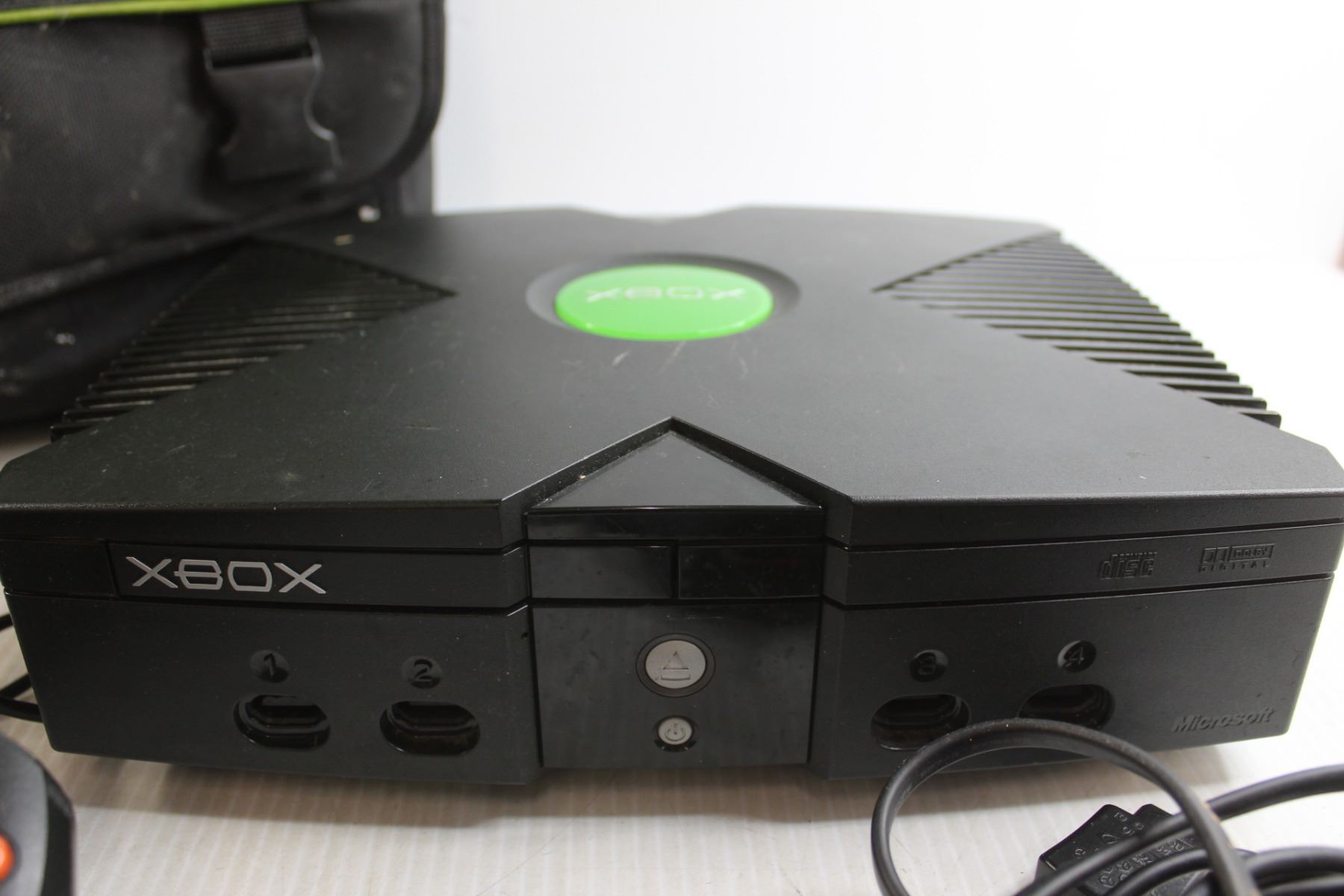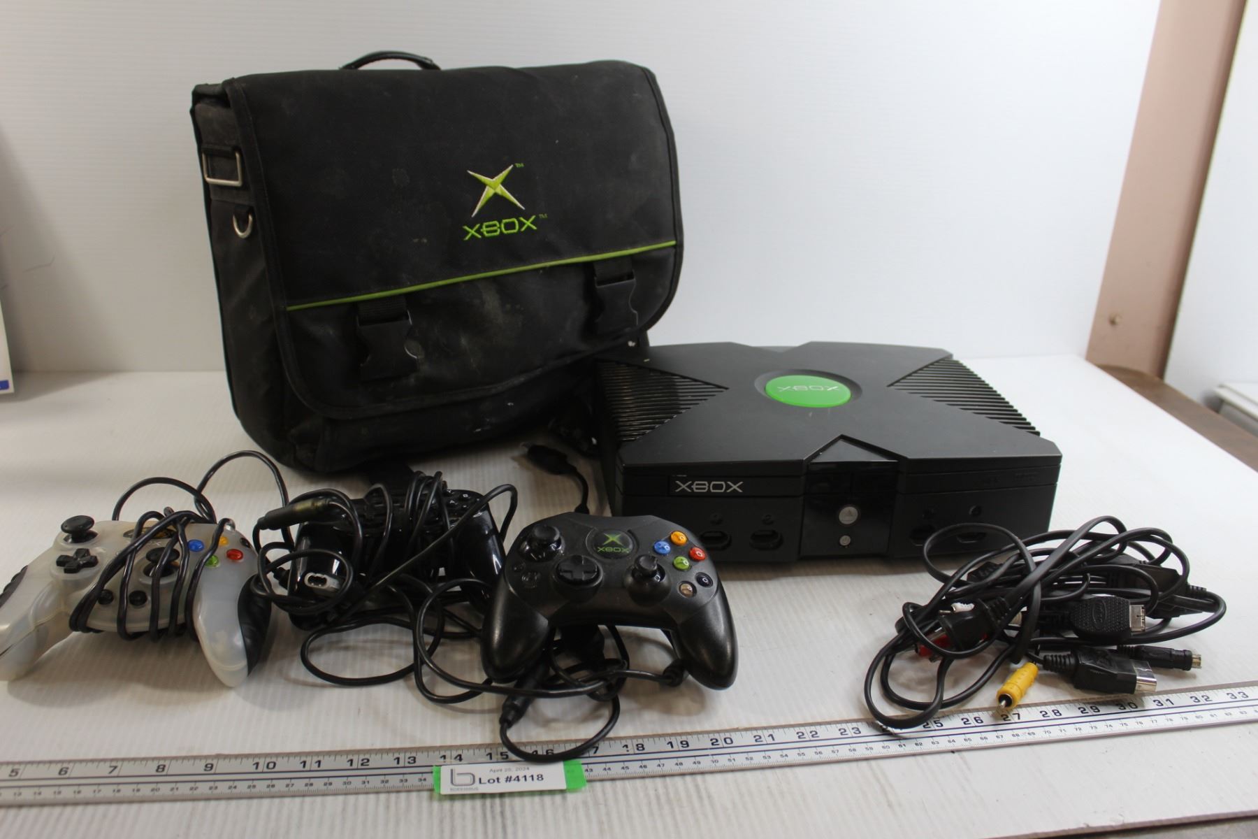 Xbox with Official Controller, (2) Off Brand Controllers, and Cords - Untested