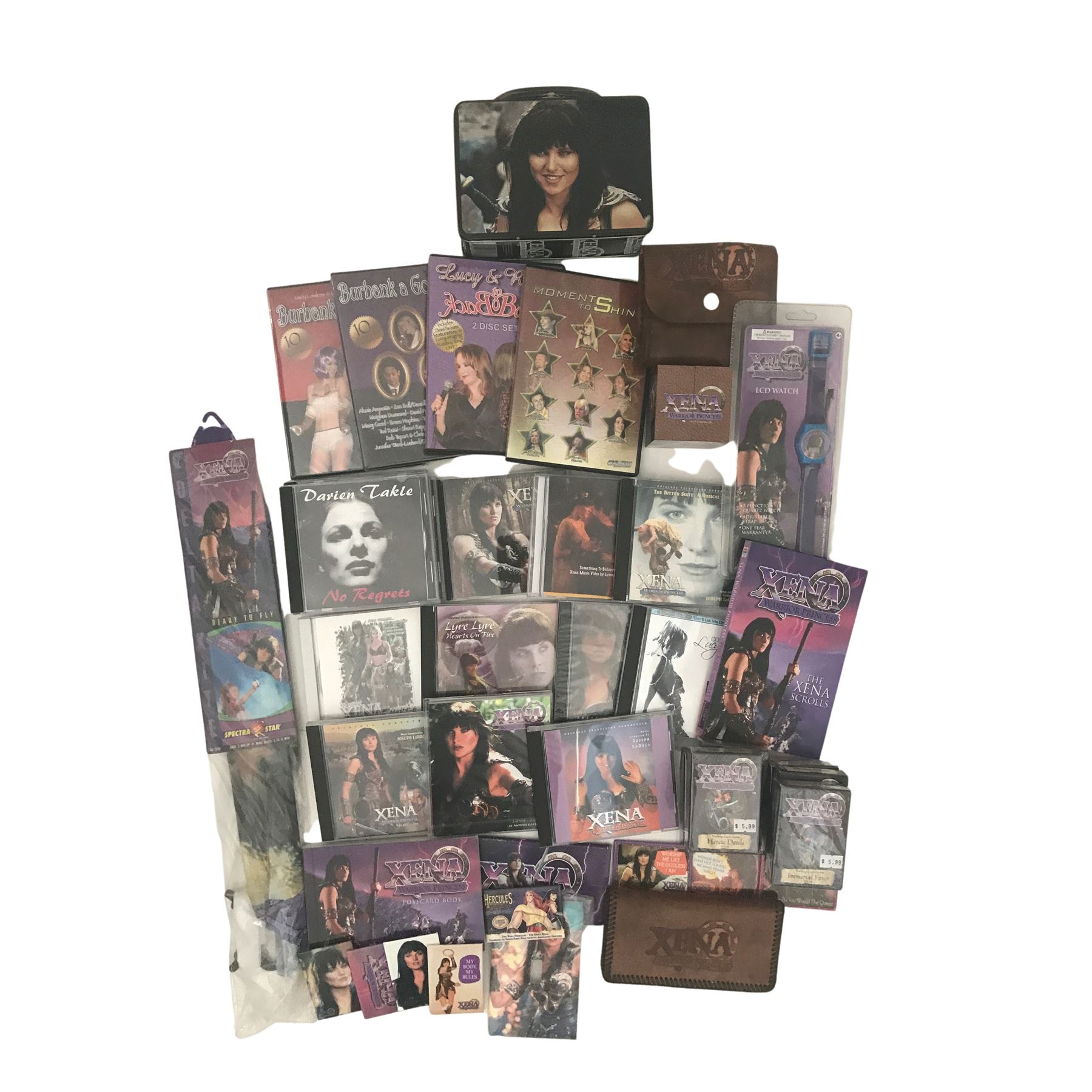 This amazing collection for the Xena: Warrior Princess fan! Includes ~11 cd's, lunch box, a couple of wallets, scrolls, trading cards (in original packaging), magnets, DVD's, lcd watch, puzzle cube, a kite and a postcard book. All items come direct from the collection of the western chairman of Xena Warrior Princess' official fan club.