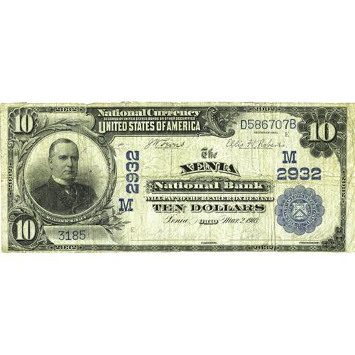 <B>Xenia, OH</B></I> - $10 1902 Date Back Fr. 616 <B>The Xenia NB</B></I> Ch. # (M)2932<BR>For collectors working on an alphabet collection there are just two possibilities, this community and Xenia, Illinois. Our offering here is only the second Date Back to surface from here in any denomination and is actually the first $10 Date Back. As such, we expect more than the typical level of interest for an issue of this bank. We should also note that of the four banks located here, this was the only one to issue the Third Charter Date Back design. <B>Fine.</B></I>