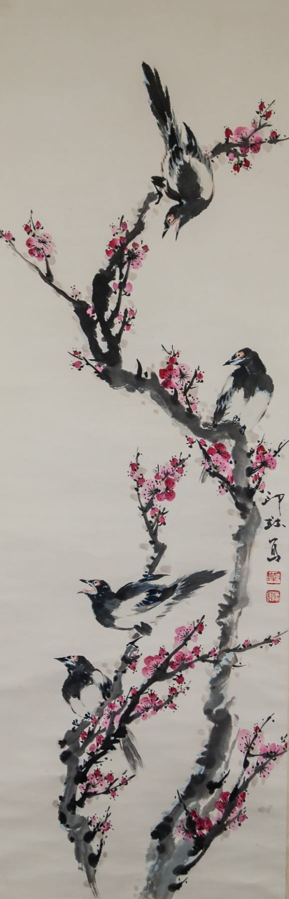 Ink and watercolor on paper, hanging scroll. Featuring magpie perching on plum blossom branches. Signed Xiao Lang (1917-2010, Chinese), inscribed with 2 artist seals. 101 x 33.5 cm