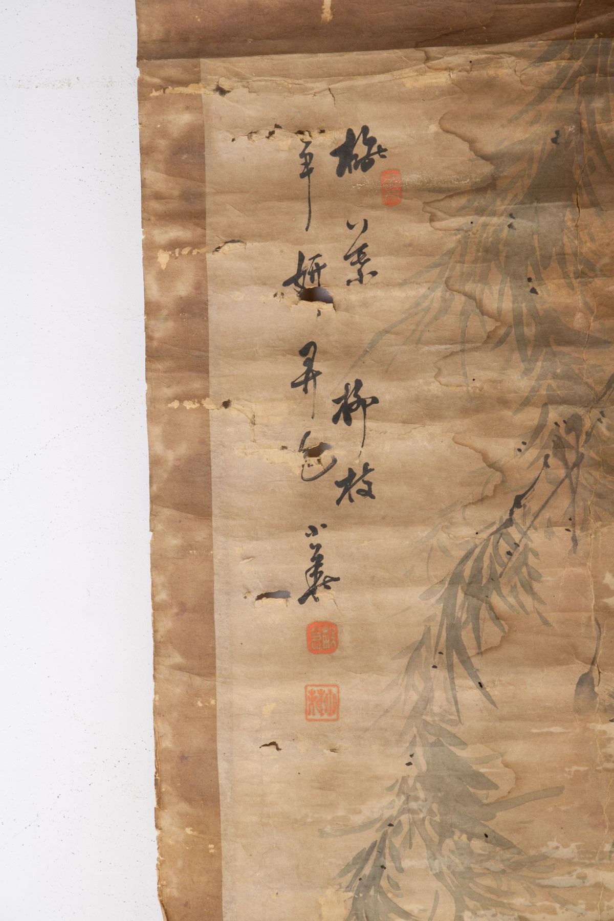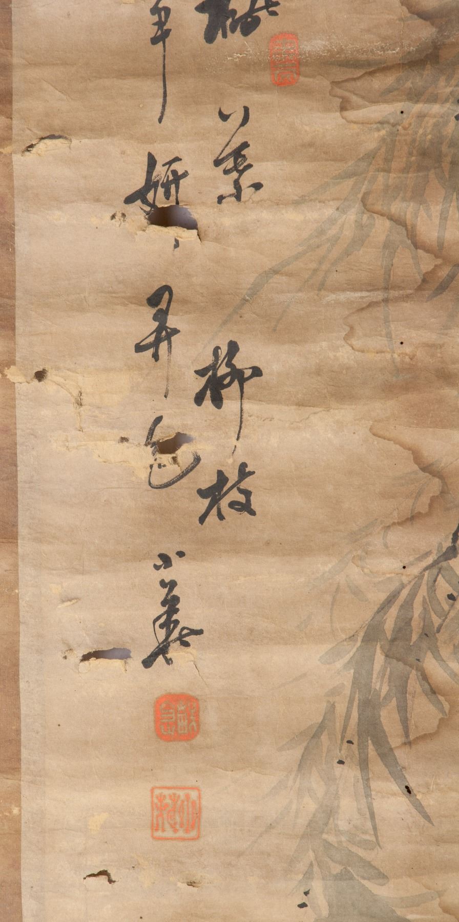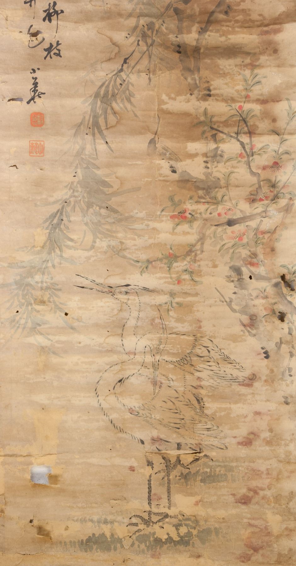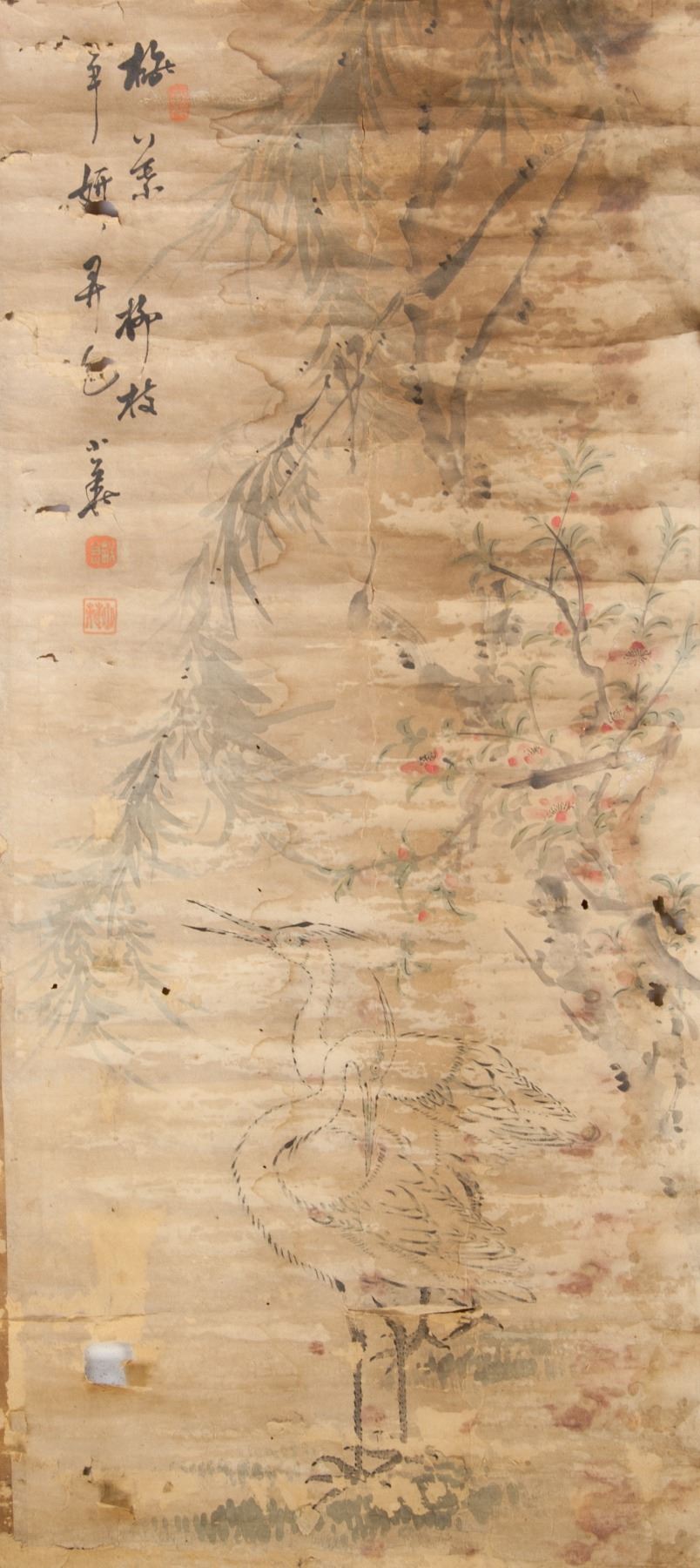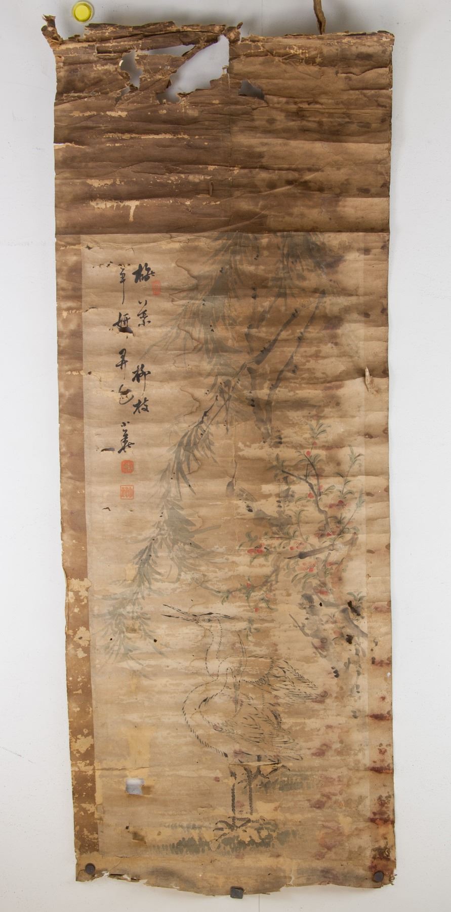 Willow and cranes; Chinese ink and watercolour on paper; hanging scroll; signed Chinese character Xiao Shan, probably Japanese artist; inscribed with 2 artist seals; 128 cm x 52 cm; Very poor condition; ripped and torn fabric, yellowing paper; Provenance: collection from United States collector since 1945 in Japan and China; found in basement after his passing.