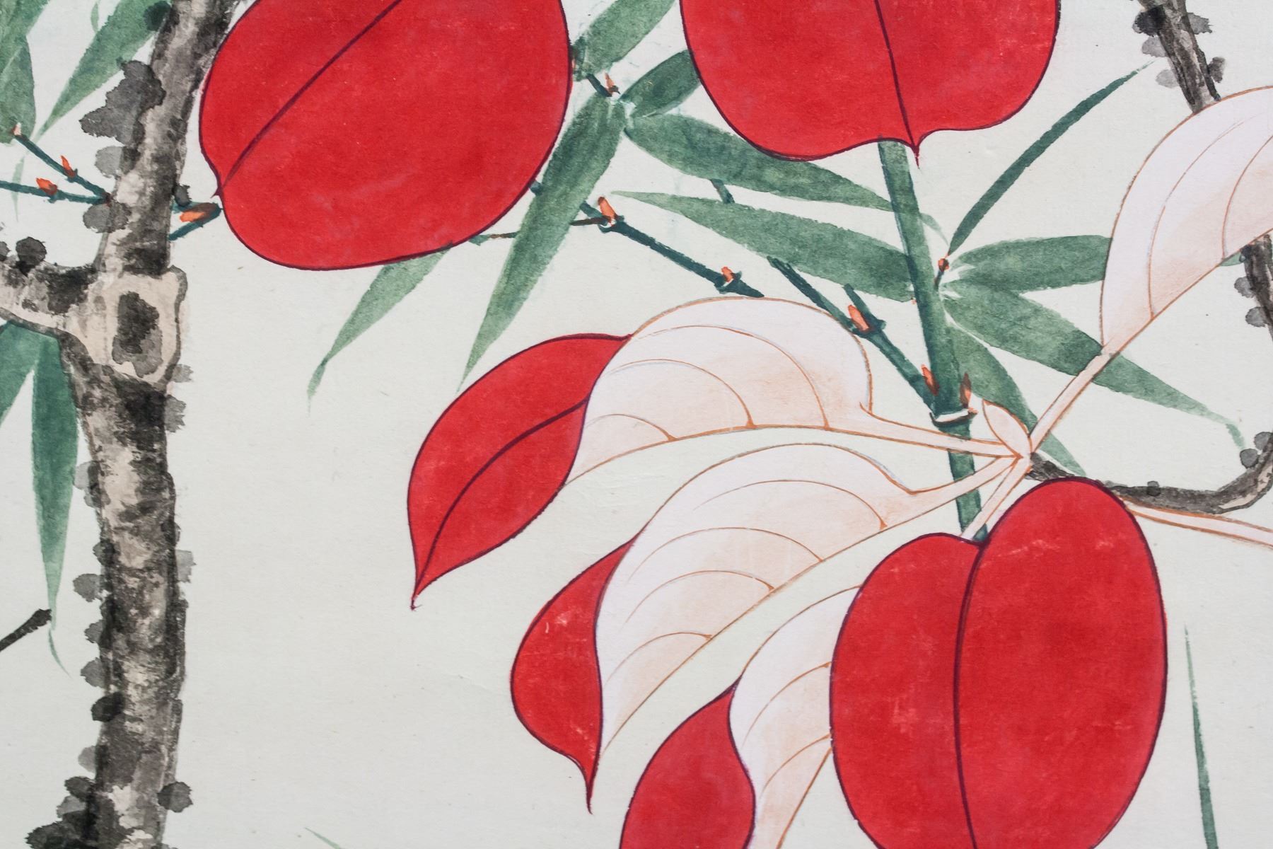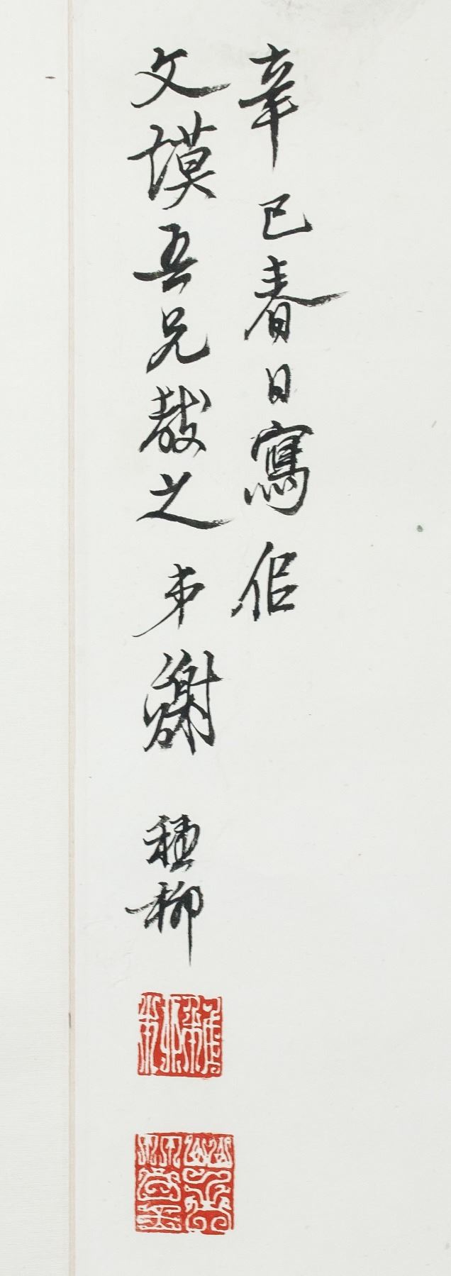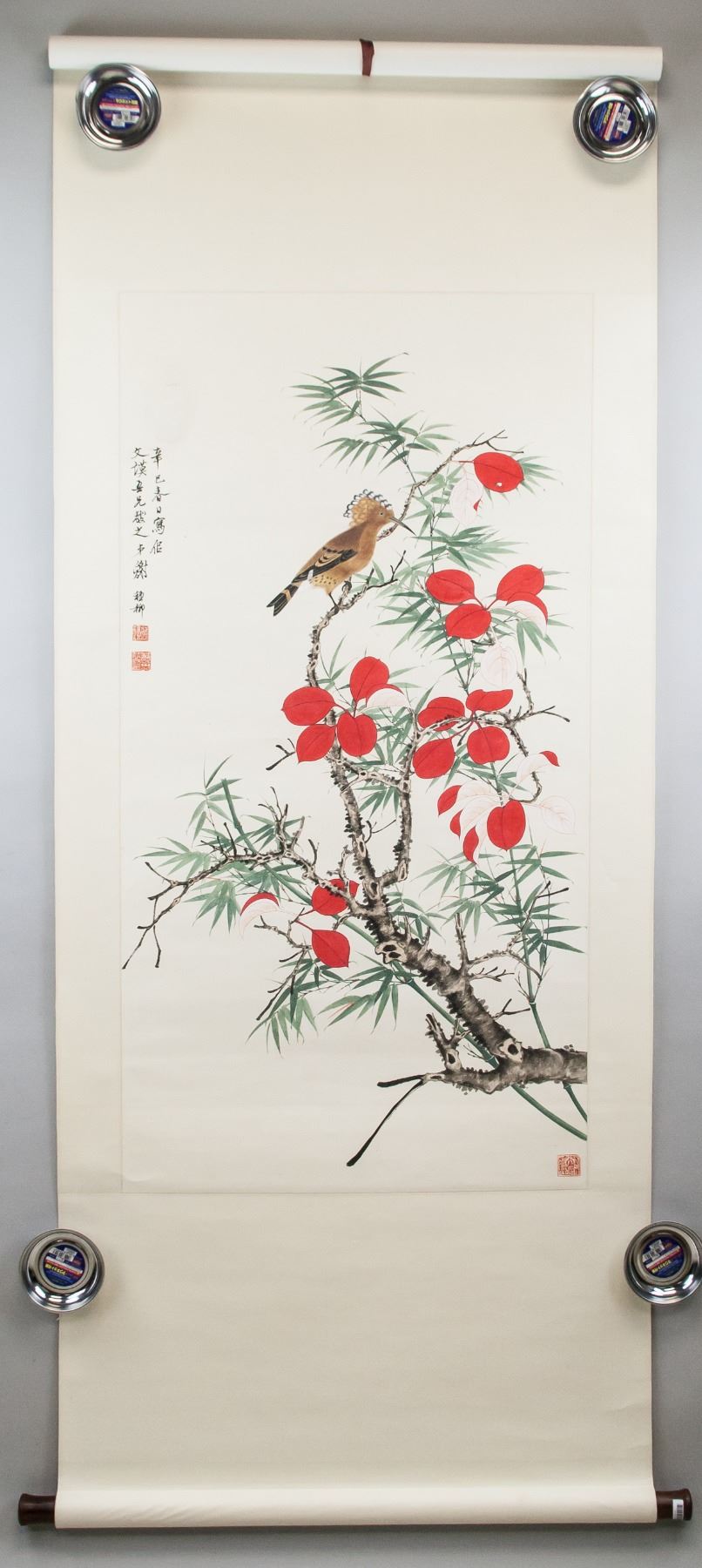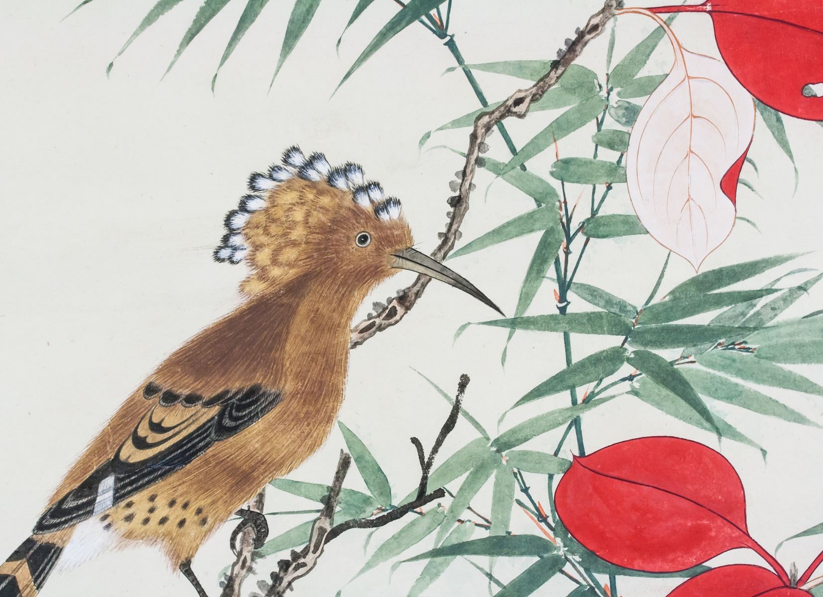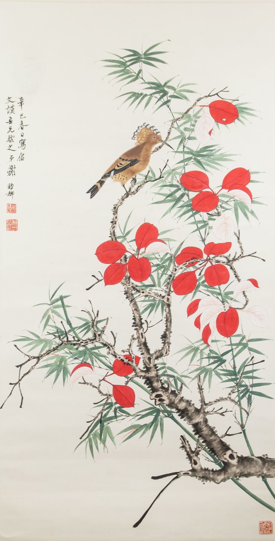Ink and watercolor on paper, hanging scroll. Featuring Eurasian hoopoe. Signed Xie Zhiliu (1910-1997, Chinese). Inscribed with 3 artist seals. 113 x 59 cm