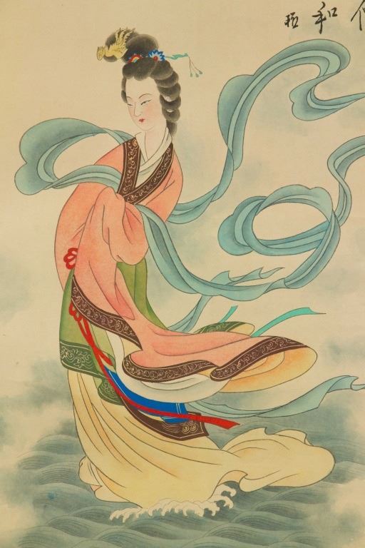 Portrait of a fairy standing on sea; Chinese ink and watercolour on paper; hanging scroll; signed Xie Zhiliu (1910-1997); inscribed with 2 artist seals; 82 cm x 44 cm