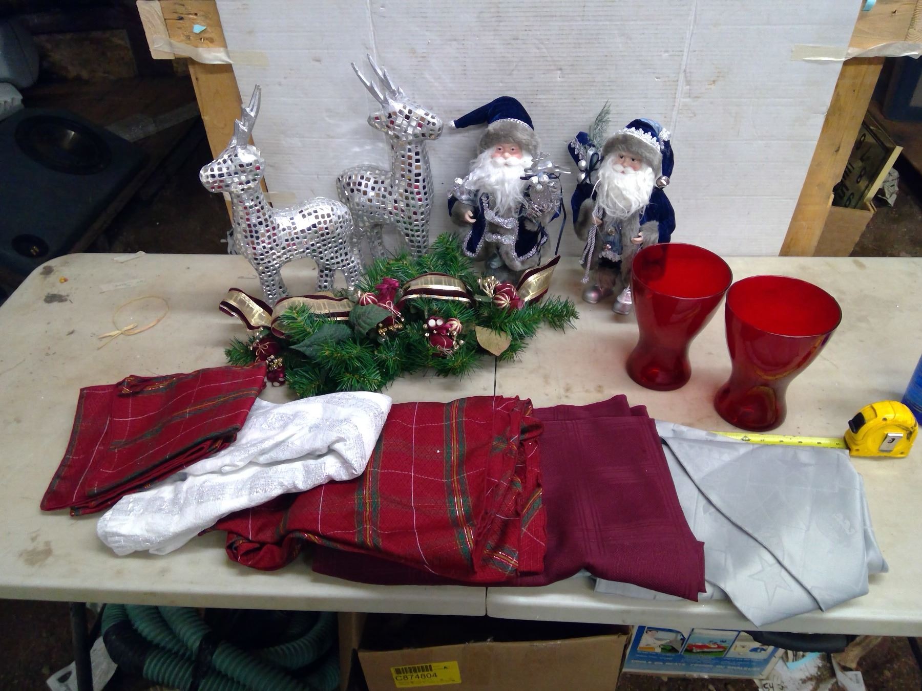 Xmas Lot - Blue Santas, Reindeer, Red Vases, and Tablecloths