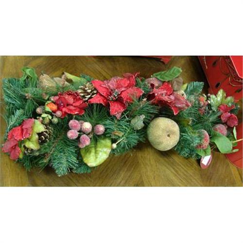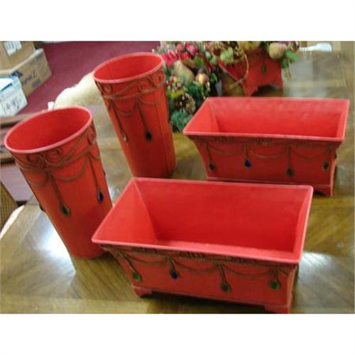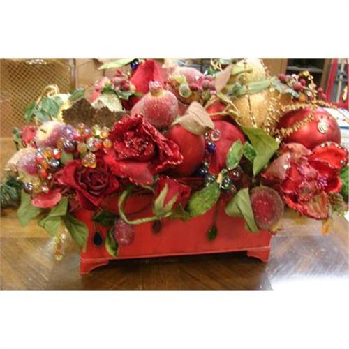 Gorgeous red floral and fruit centerpiece and long table topper set in red metal boxes with 2 planters and 2 vases to match, purch. from Fort Myers Florist.
