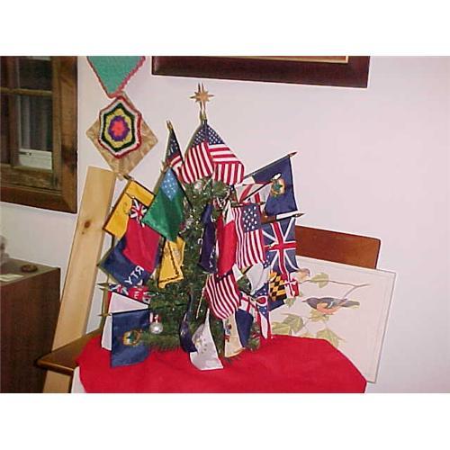 Flag, Xmas tree, artificial 29" tall decorated with many, many nation flags and other decorations (c) 1900's shown at tree festival on Bennington, Vt. Musuem tray.