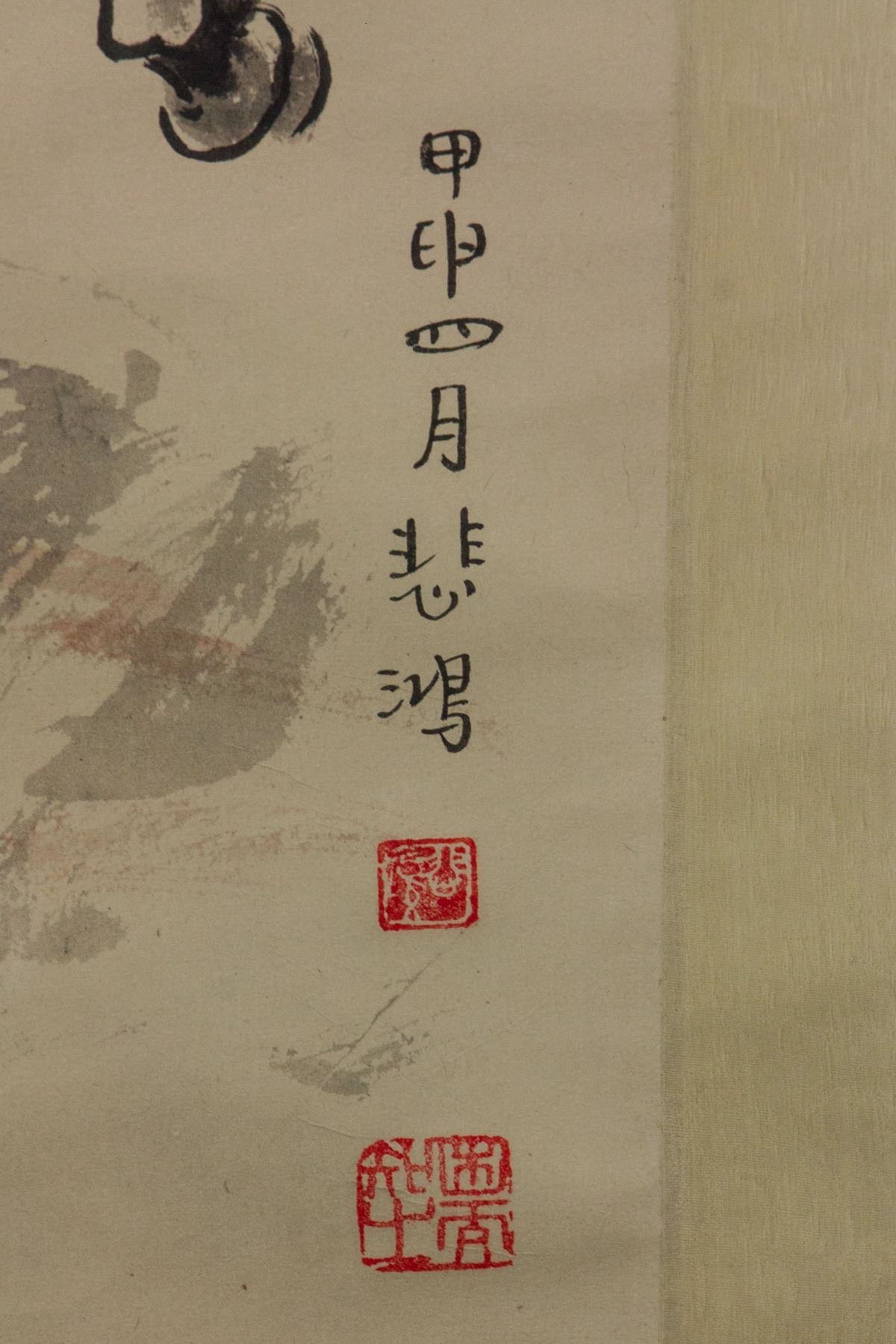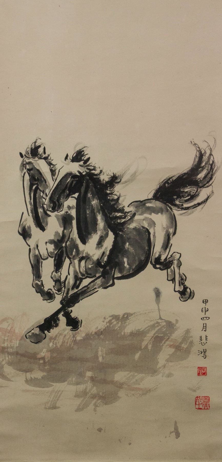 Two galloping horses; Chinese ink on paper; hanging scroll; signed Xu Beihong (1895-1953); inscribed with 2 artist seals; 87 cm x 44 cm
