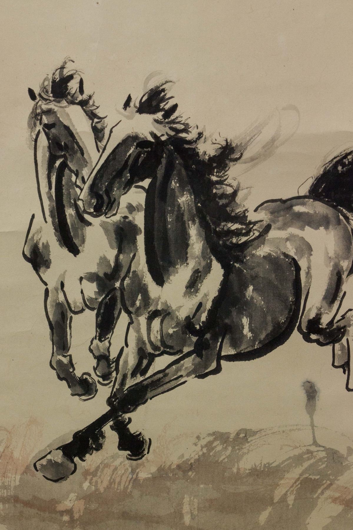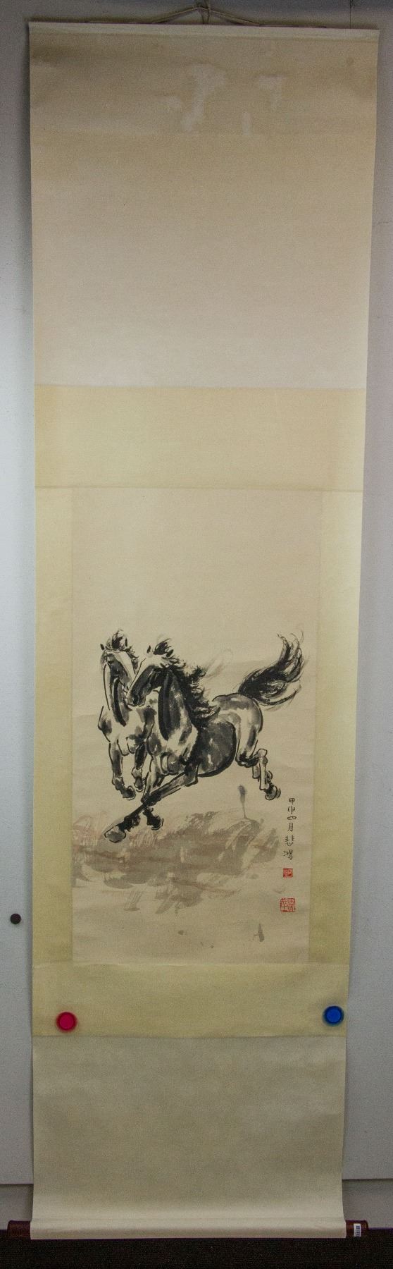 Two galloping horses; Chinese ink on paper; hanging scroll; signed Xu Beihong (1895-1953); inscribed with 2 artist seals; 87 cm x 44 cm