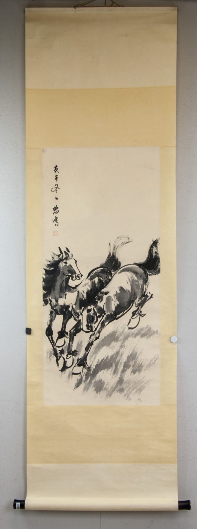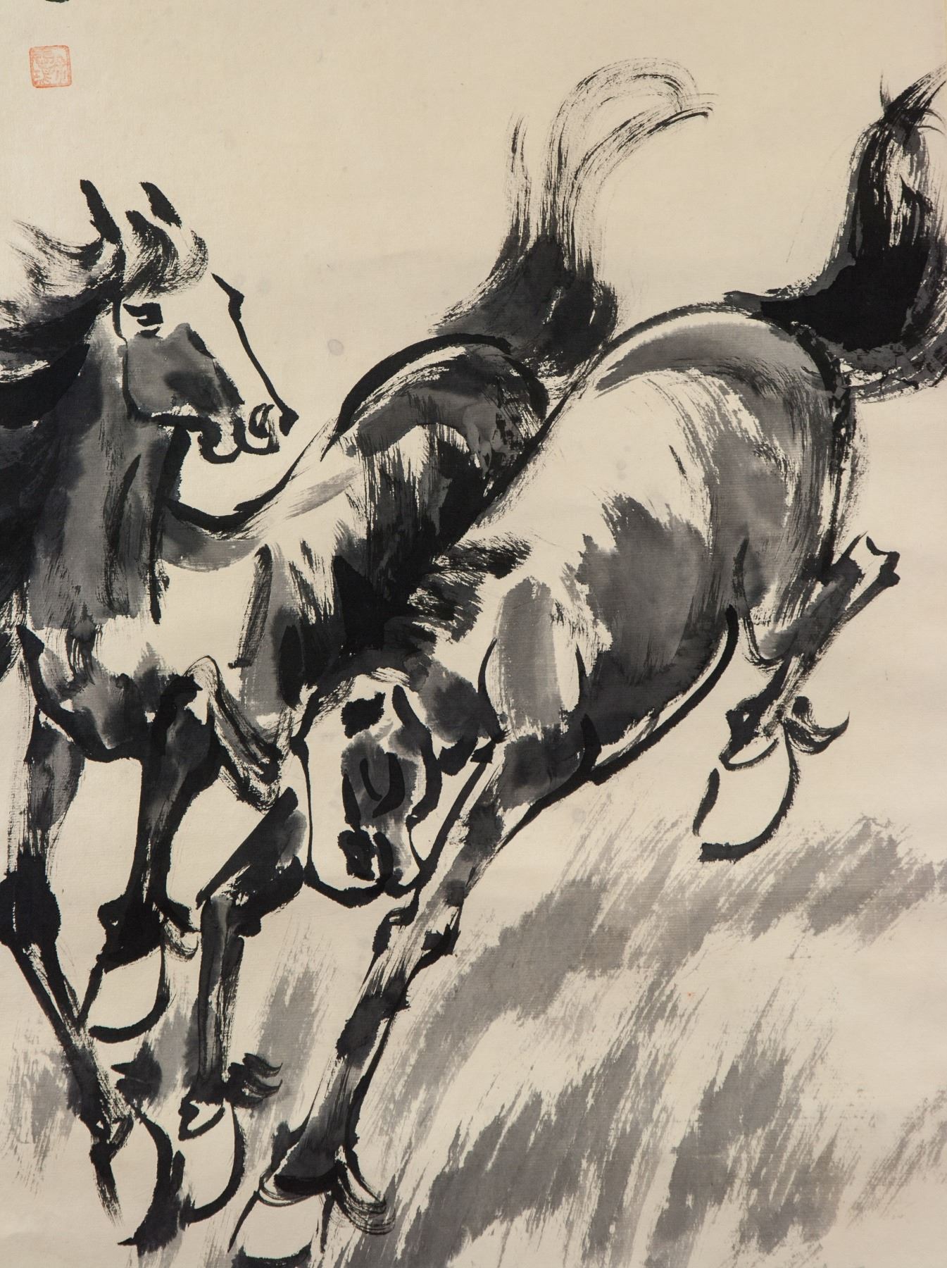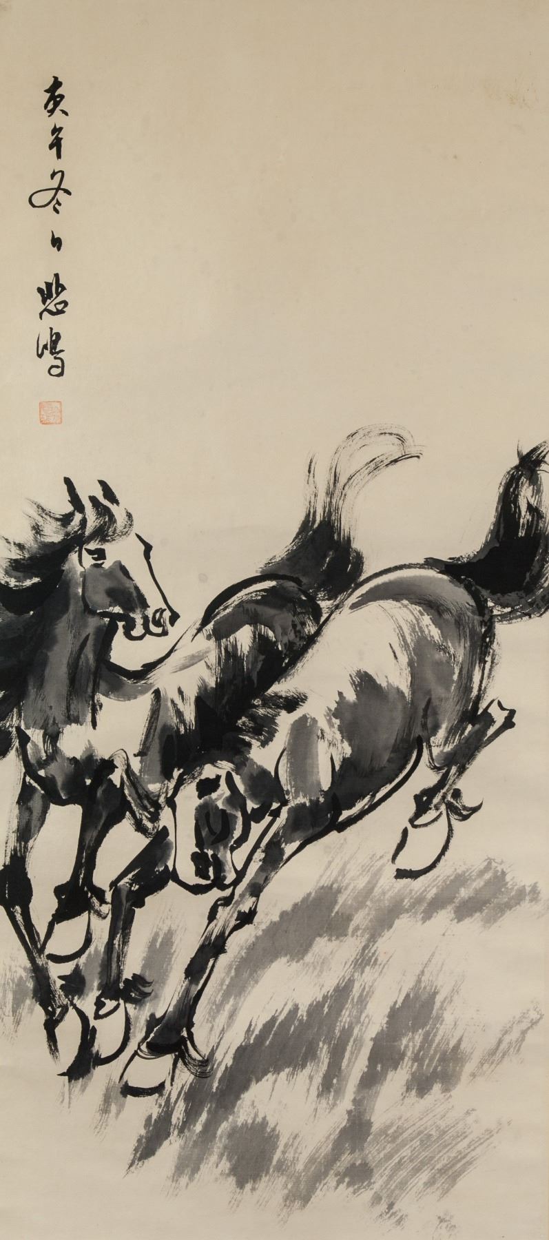 Two galloping horses; Chinese ink on paper; hanging scroll; signed Xu Beihong (1895-1953, Chinese); inscribed with 1 artist seal; 93 x 43 cm