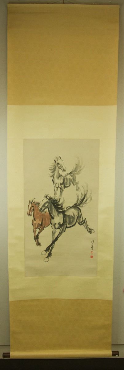 Three galloping horses; Chinese ink and watercolour on paper; hanging scroll; signed Xu Beihong (1895-1953); inscribed with two artist seals; 85 cm × 46 cm