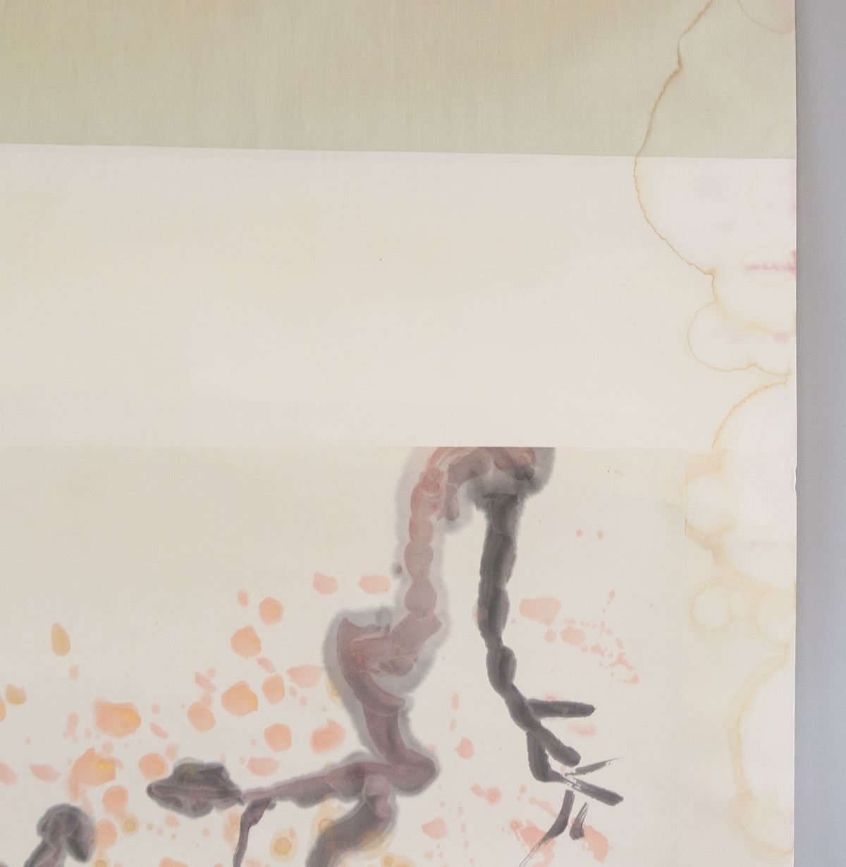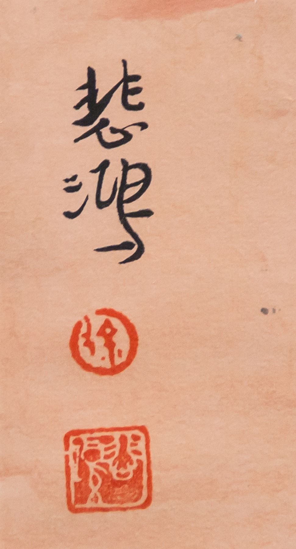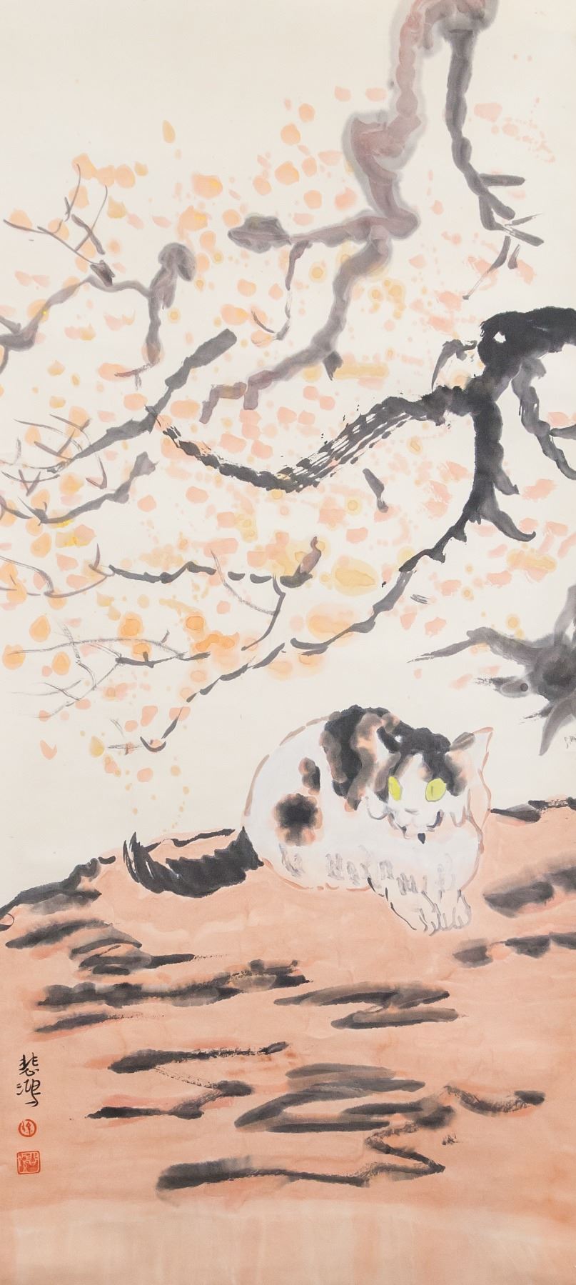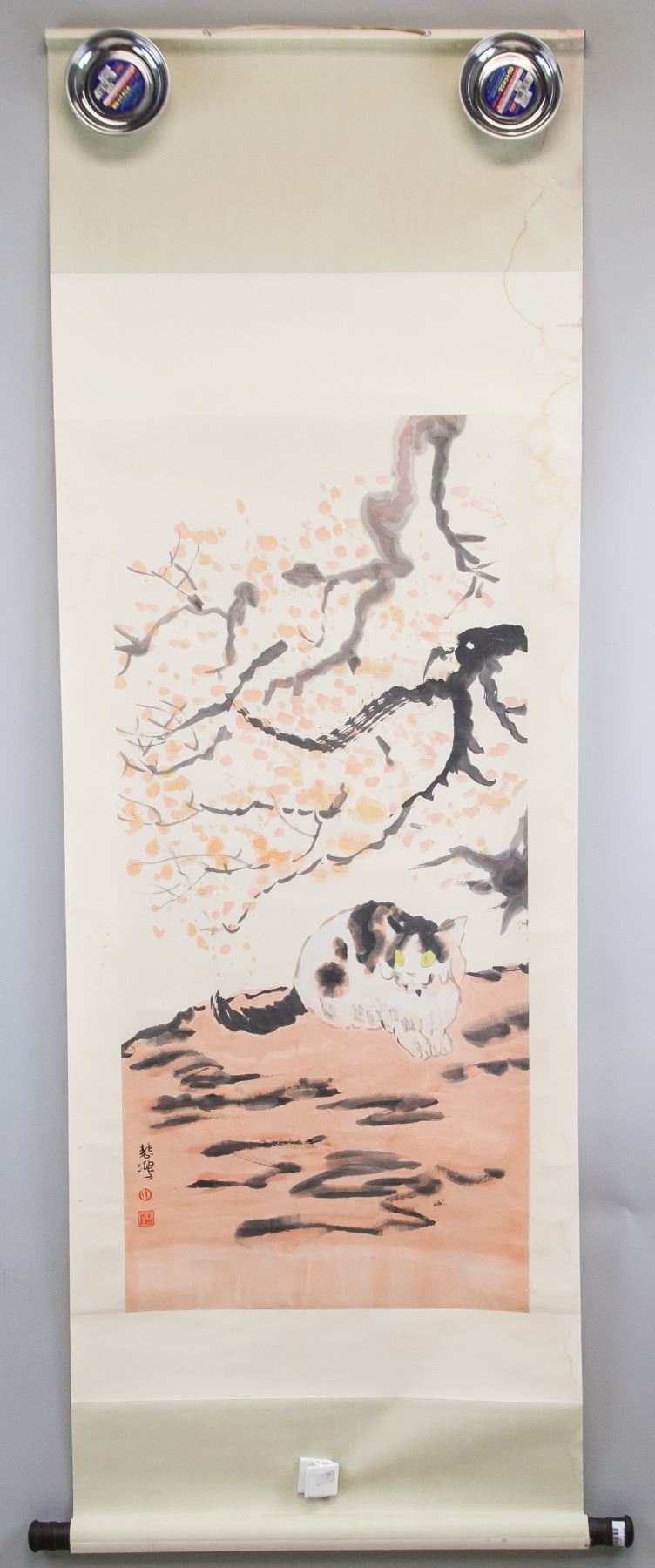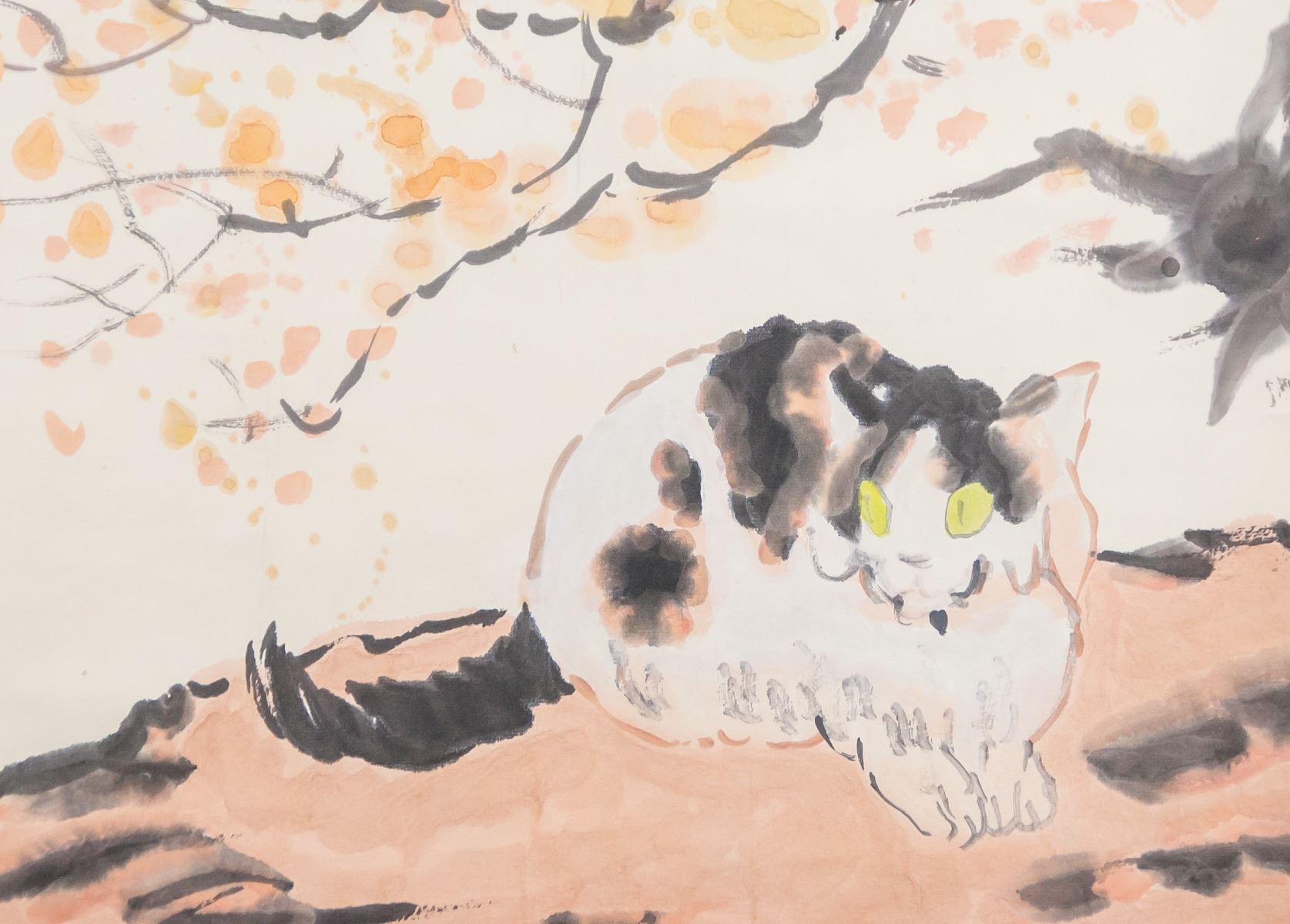 Watercolor on paper, scroll. Featuring a cat reclining underneath tree branches. Signed and inscribed with two artist's seals on the lower left corner. Attributed to Xu Beihong (1895-1953, Chinese). 94 x 43 cm