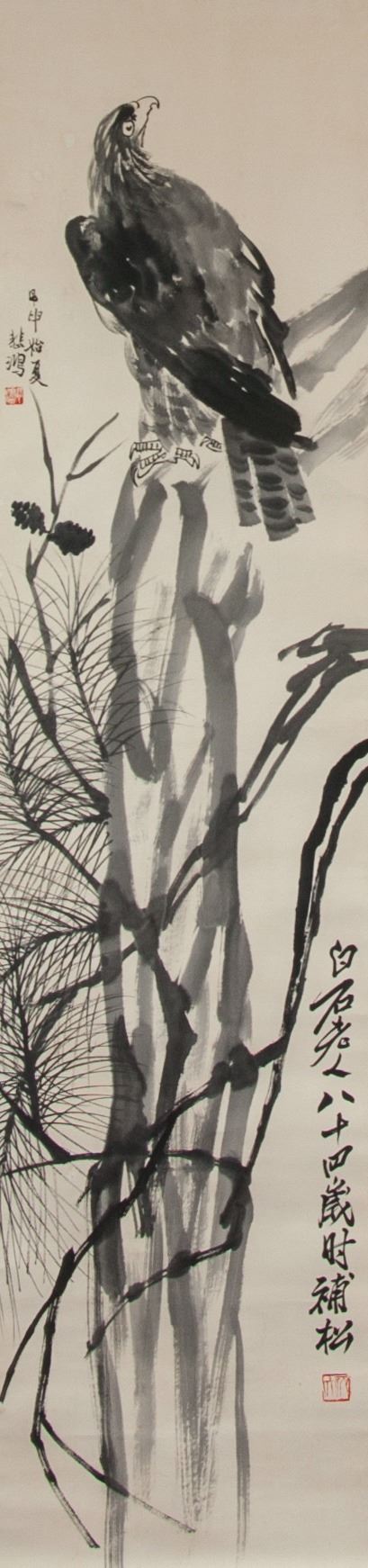 Eagle on pine tree; Chinese ink on paper; hanging scroll; signed Xu Beihong (1895-1953) and Qi Baishi (1864-1957); inscribed with 2 artist seals; 136 cm x 33 cm