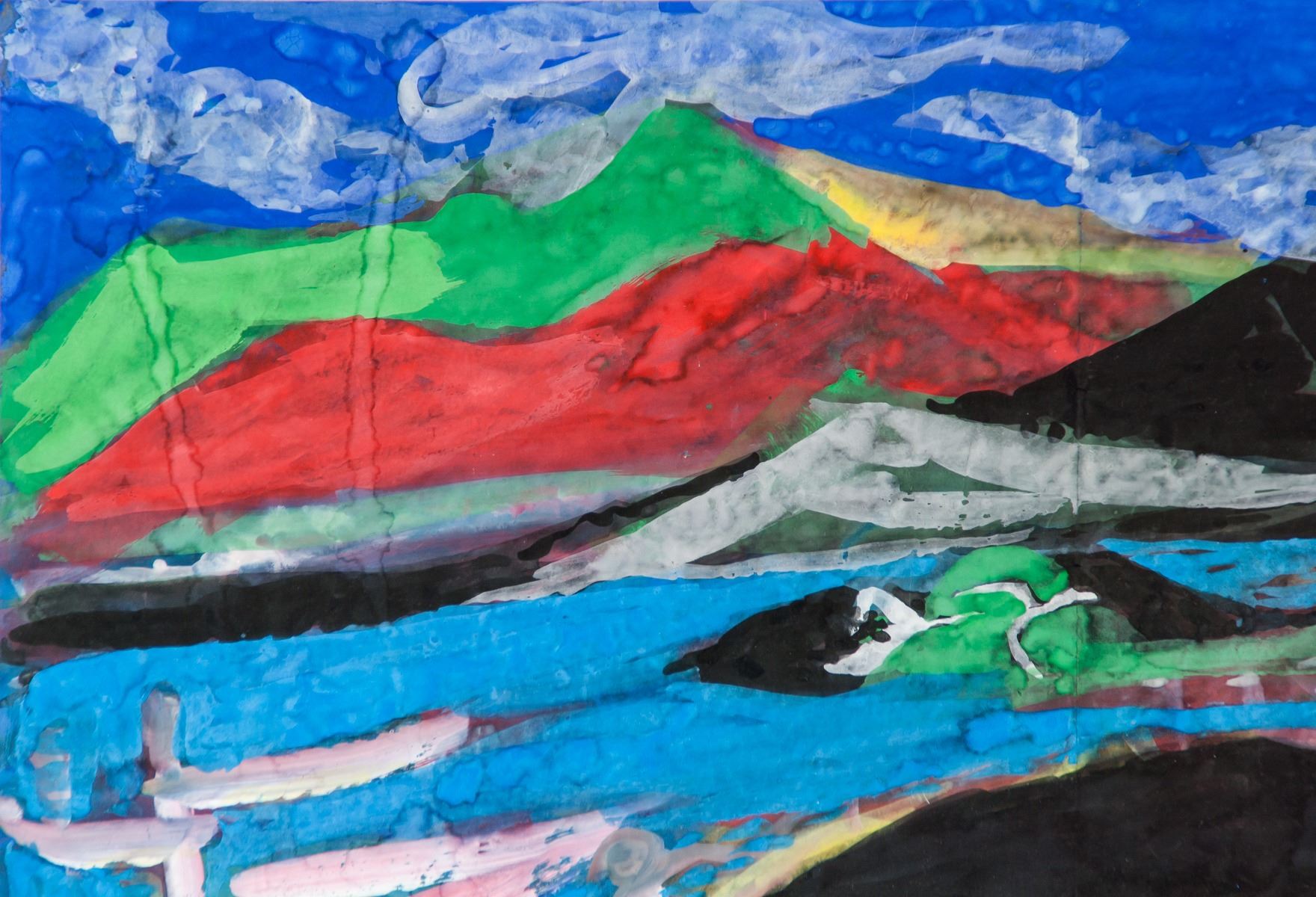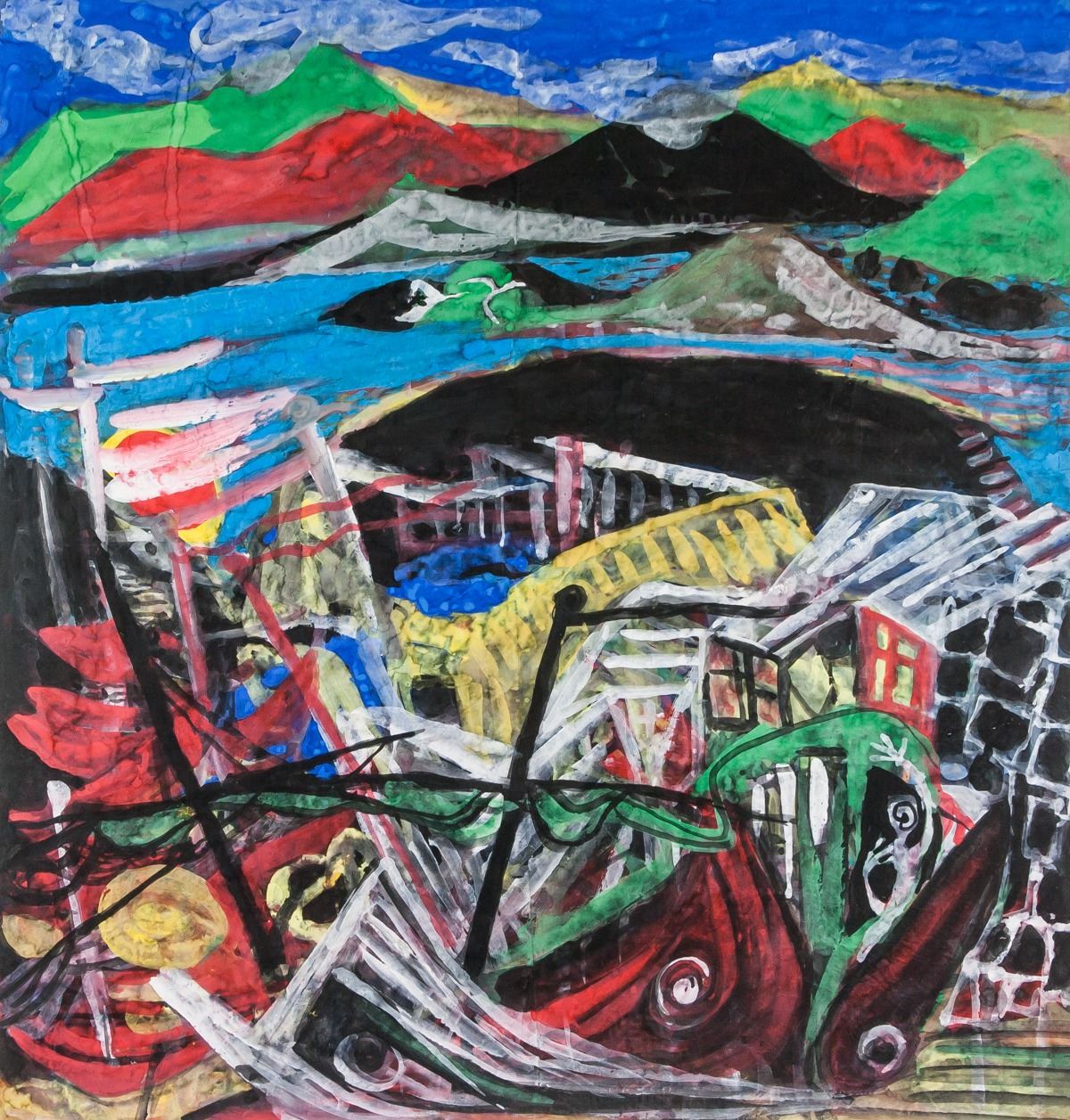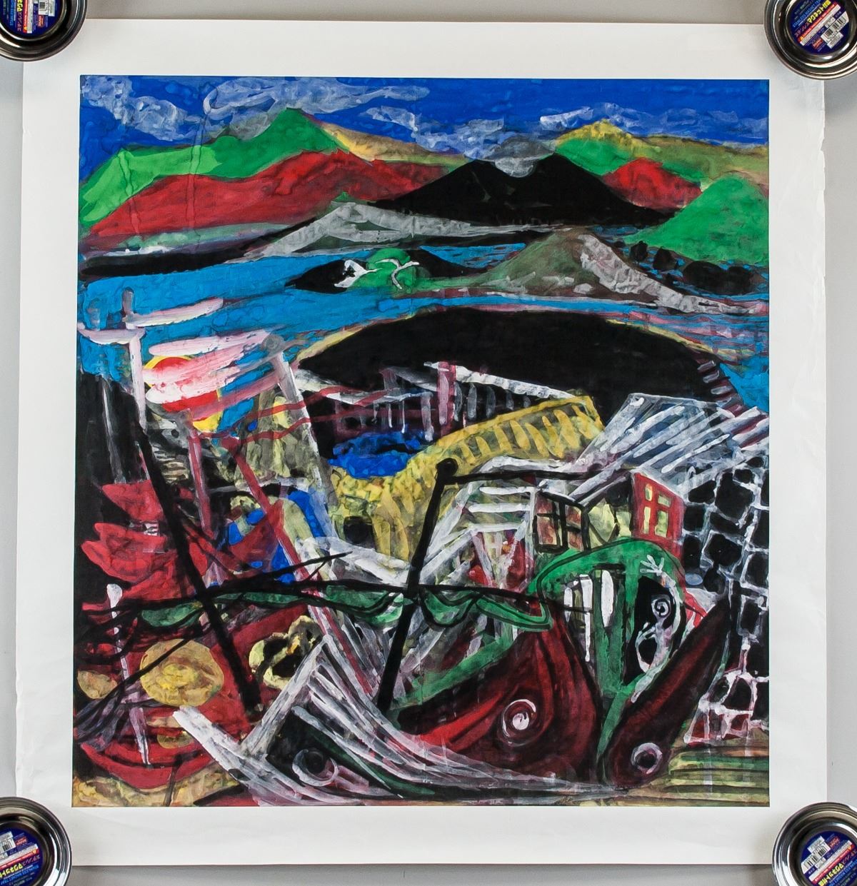 Watercolor on paper. Featuring abstract landscape. Painted by Xu Zhongfang (b.1943, Chinese). 65 x 61 cm, Xu Zhongfang is the reputated folk art artist, born 1943, Dinghai JinTang. Xu Zhongfang began painting in 1983. In 2005, he was named the top ten folk artists by Dinghai District. Later in 2009, he was titled the batch of Zhejiang outstanding folk art talent. In 2010, Xu Zhongfang was crowned the top ten folk art painter by Zhejiang Provincial Artist Association and referred as the "grassroots painter". His works of art has been exhibited worldwide in China Modern Folk Painting Exhibition, Western Australia Art Gallery Exhibition, China Arts Festival - Gallery of Modern China Folk Painting Exhibition, World's Fair in Barcelona, Spain, Zhejiang Academy of Fine Art Works Exhibition. And also featured on Landleben, Gemalt, German Folk Art Publication.