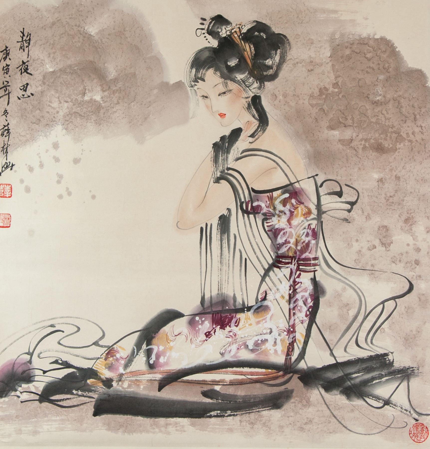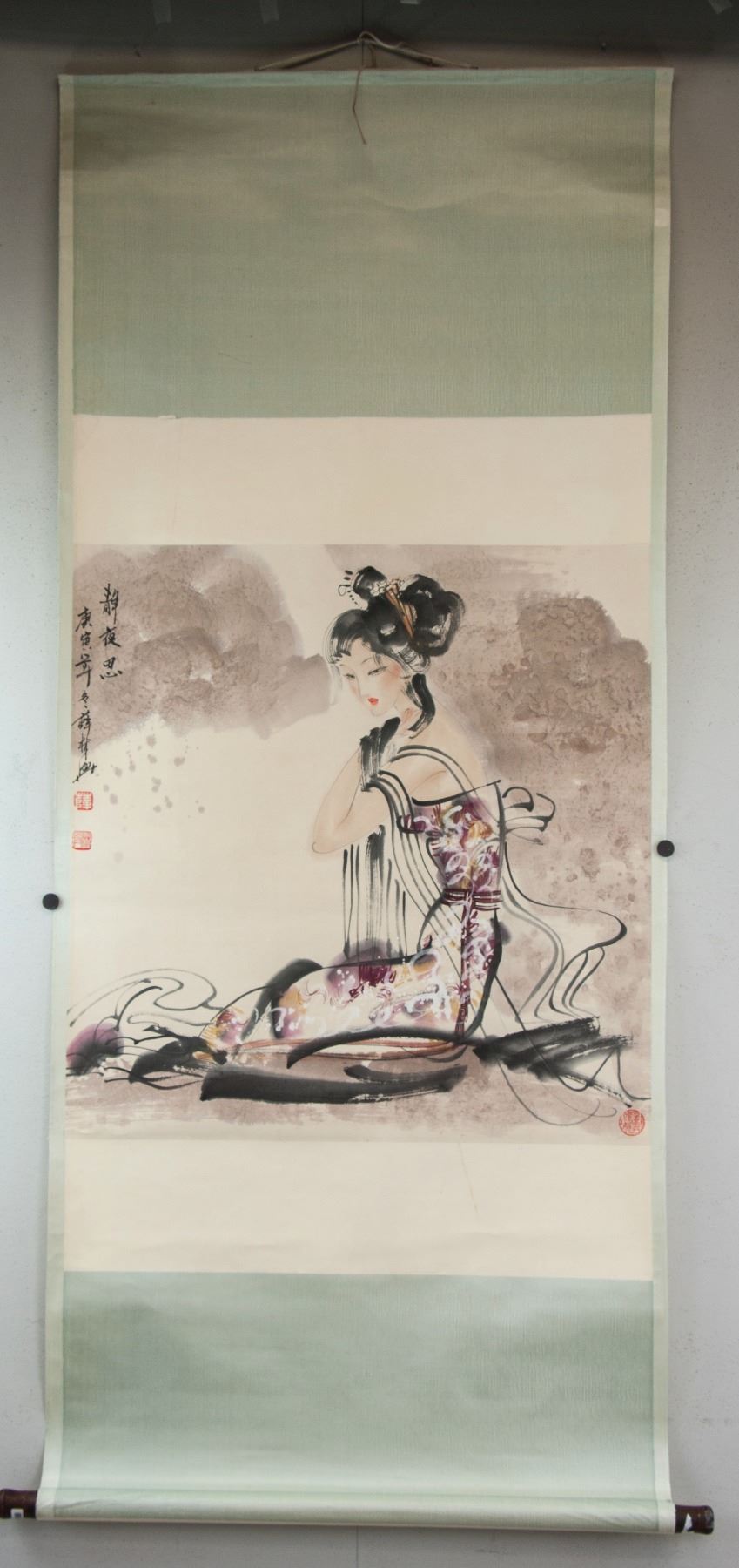 Painting of beauty; Chinese ink and watercolour on paper; hanging scroll; signed Xue Lin (20th century); inscribed with 3 artist seals; 67.5 cm x 66 cm