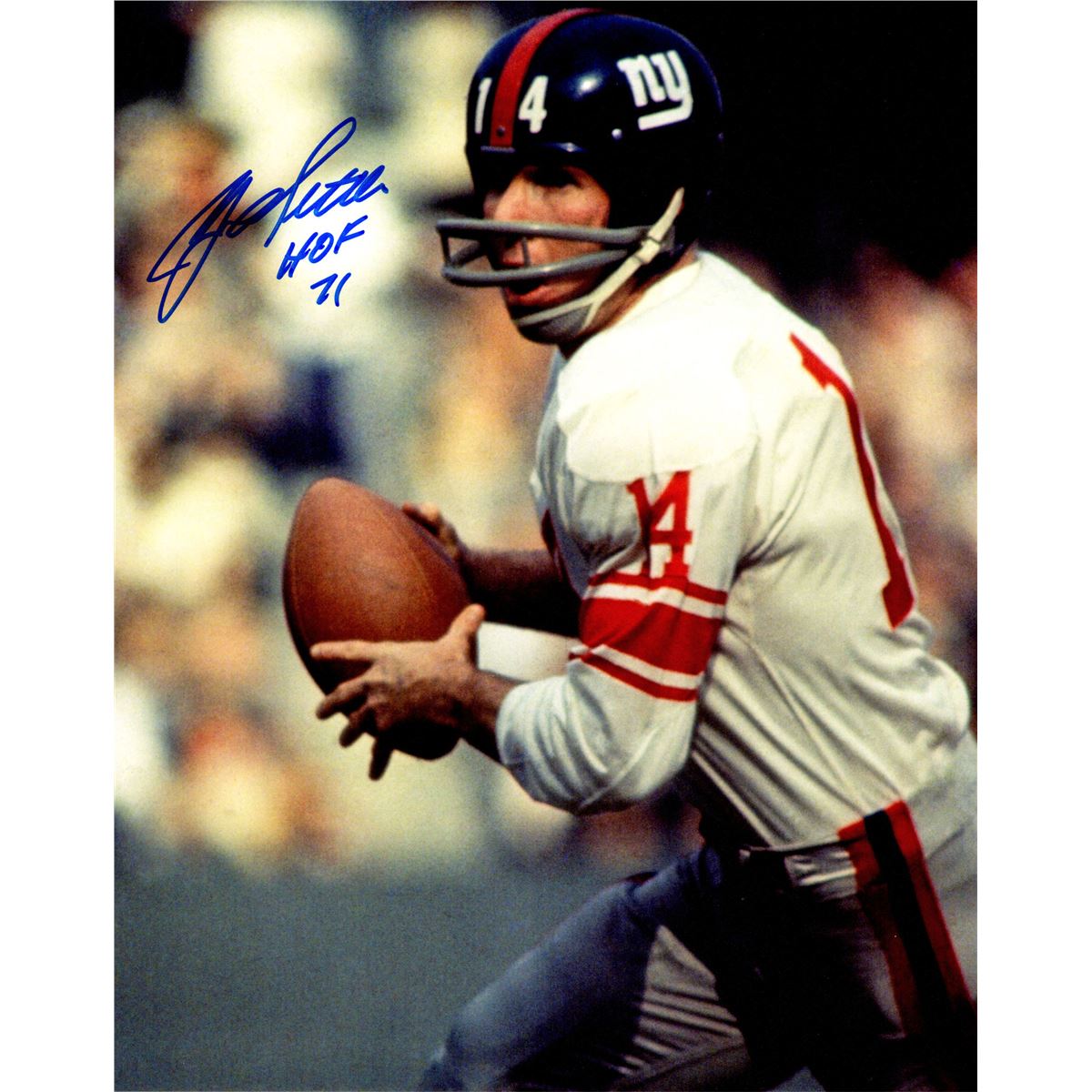 Y.A. Tittle signed Giants close up action 8x10 photo with 'HOF 71' inscription. Item comes with a Schwartz Sports Memorabilia tamper-proof numbered hologram and Certificate of Authenticity which can be verified online.
