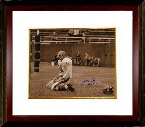 YA Tittle lead the Giants to three straight Eastern Division titles. Tittle threw seven touchdown passes on October 28, 1962, in a game against the Washington Redskins that the Giants won 49-34. In 1963, he set what was then an NFL record by throwing 36 touchdown passes. He was elected 7 times to the Pro Bowl and 3 times as an All-Pro selection. Y.A. Tittle has hand autographed this New York Giants 16x20 Sepia Tone Blood Photo with HOF 71 Inscription. Custom White Mat and Premium Mahogany Frame as shown. Certificate of Authenticity from Athlon Sports.