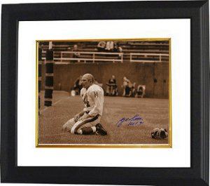 YA Tittle lead the Giants to three straight Eastern Division titles. Tittle threw seven touchdown passes on October 28, 1962, in a game against the Washington Redskins that the Giants won 49-34. In 1963, he set what was then an NFL record by throwing 36 touchdown passes. He was elected 7 times to the Pro Bowl and 3 times as an All-Pro selection. Y.A. Tittle has hand autographed this New York Giants 16x20 Sepia Tone Blood Photo with HOF 71 Inscription. Custom White Mat and Premium Black Frame as shown. Certificate of Authenticity from Athlon Sports.