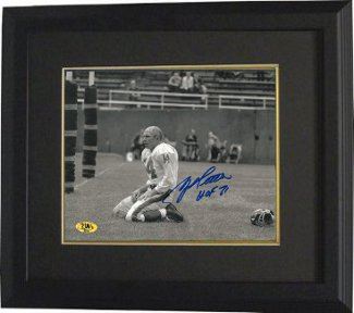 YA Tittle lead the Giants to three straight Eastern Division titles. Tittle threw seven touchdown passes on October 28, 1962, in a game against the Washington Redskins that the Giants won 49-34. In 1963, he set what was then an NFL record by throwing 36 touchdown passes. He was elected 7 times to the Pro Bowl and 3 times as an All-Pro selection. Y.A. Tittle has hand autographed this New York Giants 16X20 Sepia Horizontal Photo with HOF 71 inscription. MAB Hologram and Certificate of Authenticity from Athlon Sports. Custom Black Mat and Premium Black Frame as shown.