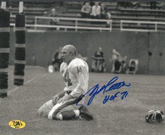 YA Tittle lead the Giants to three straight Eastern Division titles. Tittle threw seven touchdown passes on October 28, 1962, in a game against the Washington Redskins that the Giants won 49-34. In 1963, he set what was then an NFL record by throwing 36 touchdown passes. He was elected 7 times to the Pro Bowl and 3 times as an All-Pro selection. Y.A. Tittle has hand autographed this New York Giants 8X10 Sepia Horizontal Photo with HOF 71 inscription. MAB Hologram and Certificate of Authenticity from Athlon Sports.