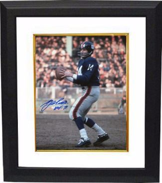 YA Tittle lead the Giants to three straight Eastern Division titles. Tittle threw seven touchdown passes on October 28, 1962, in a game against the Washington Redskins that the Giants won 49-34. In 1963, he set what was then an NFL record by throwing 36 touchdown passes. He was elected 7 times to the Pro Bowl and 3 times as an All-Pro selection. Y.A. Tittle has hand autographed this New York Giants 8X10 Color Photo with HOF 71 inscription. MAB Hologram and Certificate of Authenticity from Athlon Sports. Custom White Mat and Premium Black Frame as shown.