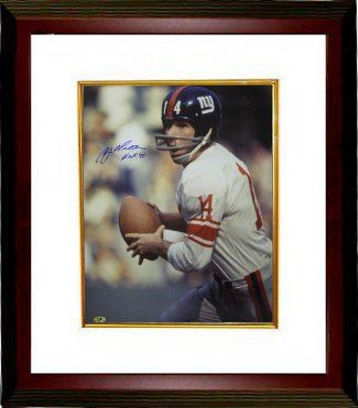 YA Tittle lead the Giants to three straight Eastern Division titles. Tittle threw seven touchdown passes on October 28, 1962, in a game against the Washington Redskins that the Giants won 49-34. In 1963, he set what was then an NFL record by throwing 36 touchdown passes. He was elected 7 times to the Pro Bowl and 3 times as an All-Pro selection. Y.A. Tittle has hand autographed this New York Giants 16x20 Color Photo with HOF 71 inscription. MAB Hologram and Certificate of Authenticity from Athlon Sports. Custom White Mat and Premium Mahogany Color Framed as shown.