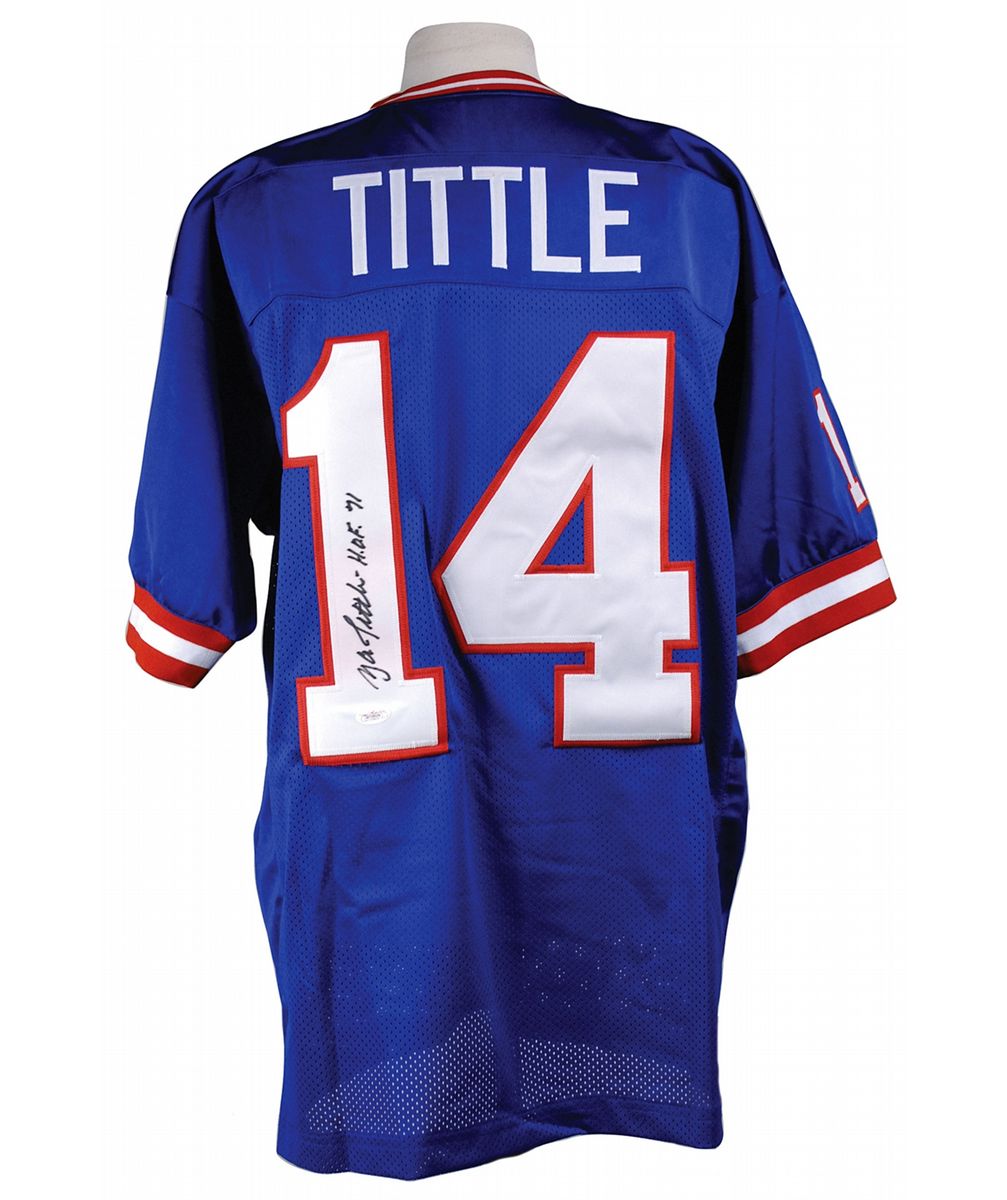 Replica New York Giants football jersey, with sewn on letters and numbers, signed in black felt tip on the number on the back, “Y. A. Tittle, HOF 71.” In fine condition, with a JSA label affixed to the number. Accompanied by a certificate of authenticity from JSA.