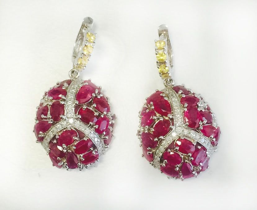 Y.SAPPHIRE 0.67CT / BURMA RUBY 16.48CT, 14K W/G EARRING 16.61GRAM / DIAMOND 1.36CT