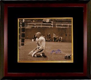 YA Tittle lead the Giants to three straight Eastern Division titles. Tittle threw seven touchdown passes on October 28, 1962, in a game against the Washington Redskins that the Giants won 49-34. In 1963, he set what was then an NFL record by throwing 36 touchdown passes. He was elected 7 times to the Pro Bowl and 3 times as an All-Pro selection. Y.A. Tittle has hand autographed this New York Giants 16x20 Sepia Tone Blood Photo with HOF 71 Inscription. Custom Black Mat and Premium Mahogany Frame as shown. Certificate of Authenticity from Athlon Sports.