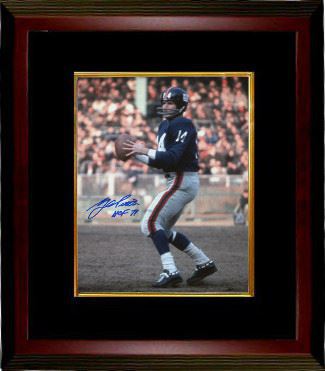 YA Tittle lead the Giants to three straight Eastern Division titles. Tittle threw seven touchdown passes on October 28, 1962, in a game against the Washington Redskins that the Giants won 49-34. In 1963, he set what was then an NFL record by throwing 36 touchdown passes. He was elected 7 times to the Pro Bowl and 3 times as an All-Pro selection. Y.A. Tittle has hand autographed this New York Giants 8X10 Color Photo with HOF 71 inscription. MAB Hologram and Certificate of Authenticity from Athlon Sports. Custom Black Mat and Premium Mahogany Frame as shown.