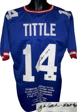 YA Tittle lead the Giants to three straight Eastern Division titles. Tittle threw seven touchdown passes on October 28, 1962, in a game against the Washington Redskins that the Giants won 49-34. In 1963, he set what was then an NFL record by throwing 36 touchdown passes. He was elected 7 times to the Pro Bowl and 3 times as an All-Pro selection. Y.A. Tittle has hand autographed this New York Giants Wilson Jersey with HOF 71 inscription with Embroidered Stats. AAA Hologram and Certificate of Authenticity from Athlon Sports.