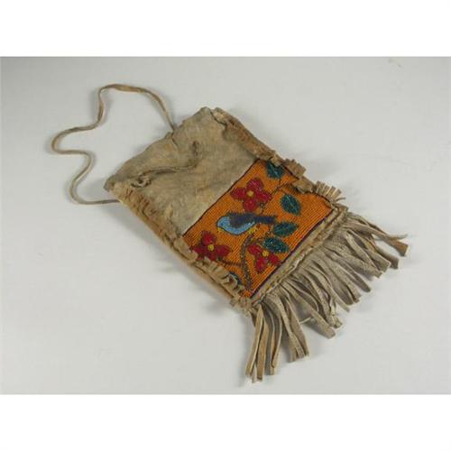 BEADWORK: Yakama beaded leather fringed bag of brain-tanned hide having velvet facing at reverse, beading portion depicting a bird upon a tree branch upon an orange ground; early 20th c. Approx. 6'' x 8.25''