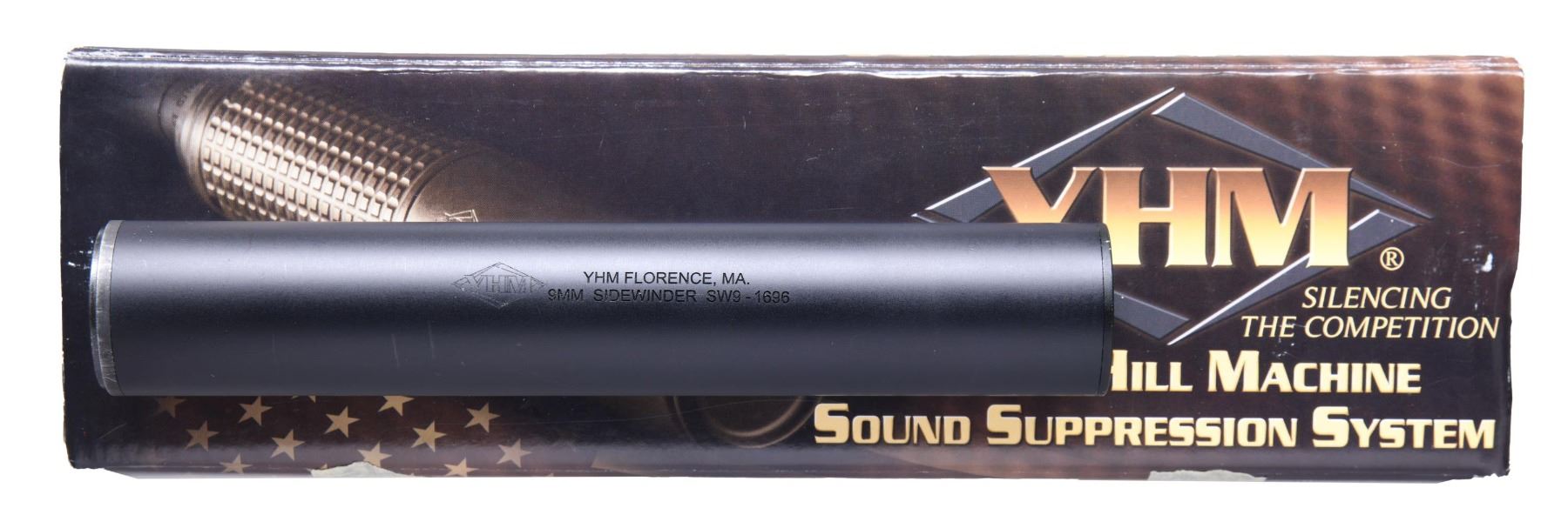 Cal. 9mm. S# SW9-1696. A monocore baffle design manufactured from 7075-T6 aluminum. Outer tube built from 6061-T6 aircraft quality aluminum finished w/ class 3 hardcoat anodizing. Will accept Nielsen device (not included) for use on most pistols . May be utilized wet or dry. UNATTACHED ACCESSORIES: Factory box (marked "display") & paperwork. CONDITION: Finish complete & consistent w/ gentle thinning, primarily on end caps. NATIONAL FIREARMS ACT SOUND SUPPRESSOR REQUIRING BATF TRANSFER BEFORE TAKING POSSESSION. FULLY TRANSFERABLE. (03-1851/JZ). MODERN CLASS III. $200-400.