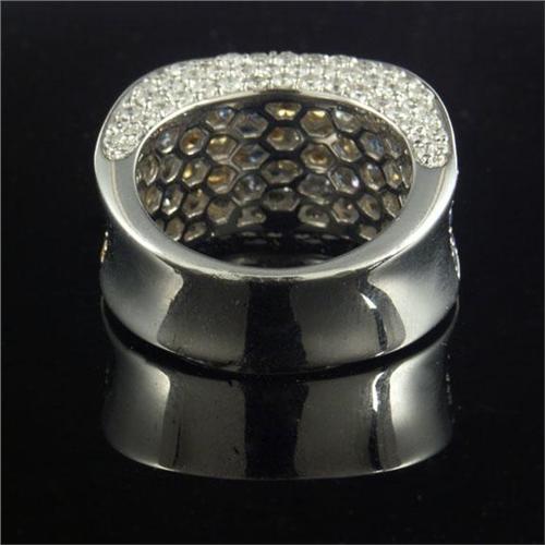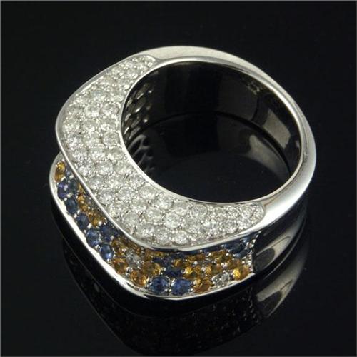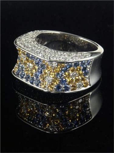 RING: Brilliant 18K white gold ring with pave set blue and yellow sapphire and diamonds. Eighty-one round cut sapphires measure approximately 2.50 ctw. Ninety-six diamonds measure approximately 3.25 ctw., have SI1 to SI2 clarity and G color. Appraisal included.