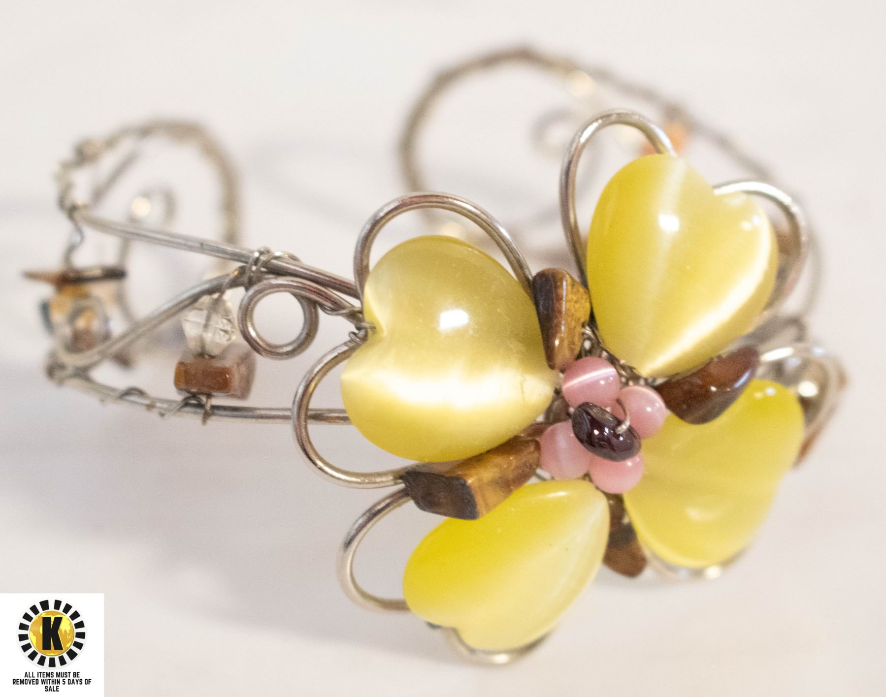 EYE BEADS AND NATURAL TIGER'S EYE ACCENTS SILVER TONE BRACELET. JEWELRY