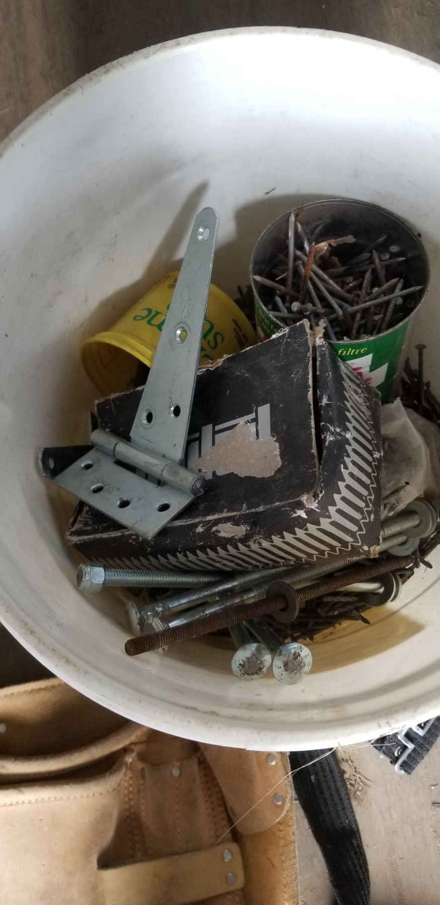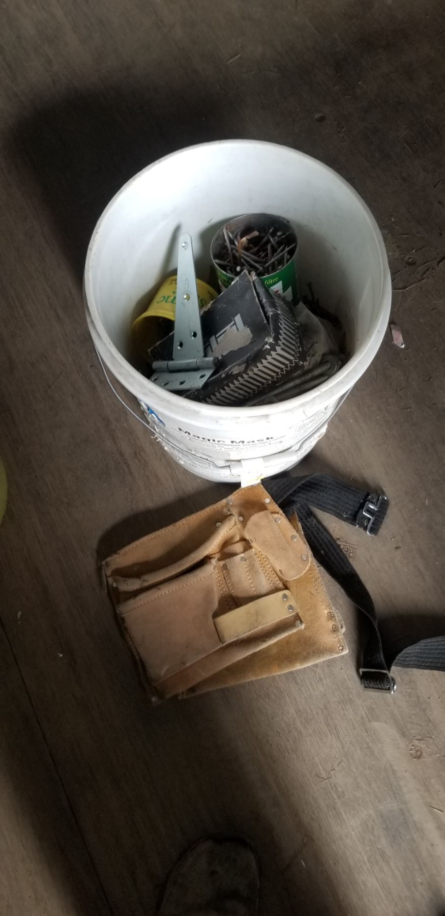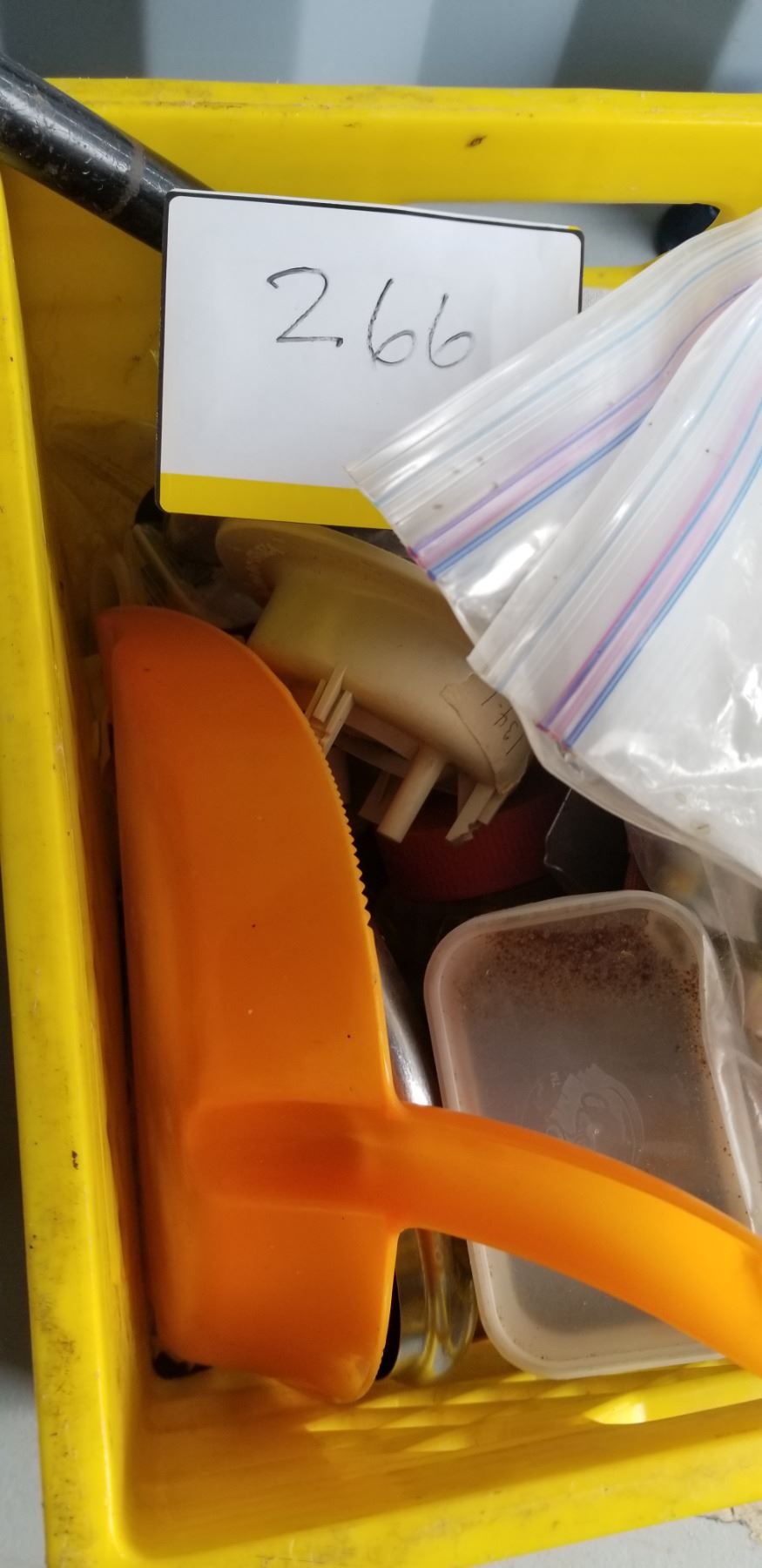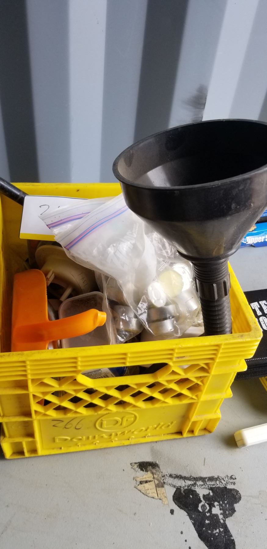 YELLOW CRATE AND BUCKET WITH MISC ITEMS