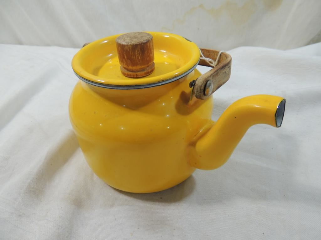 YELLOW ENAMEL TEAPOT YELLOW METAL TEA POT WITH WOOD HANDLE MID CENTURY STYLE KETTLE AS SHOWN SEE PHOTO FOR MORE DETAILS.